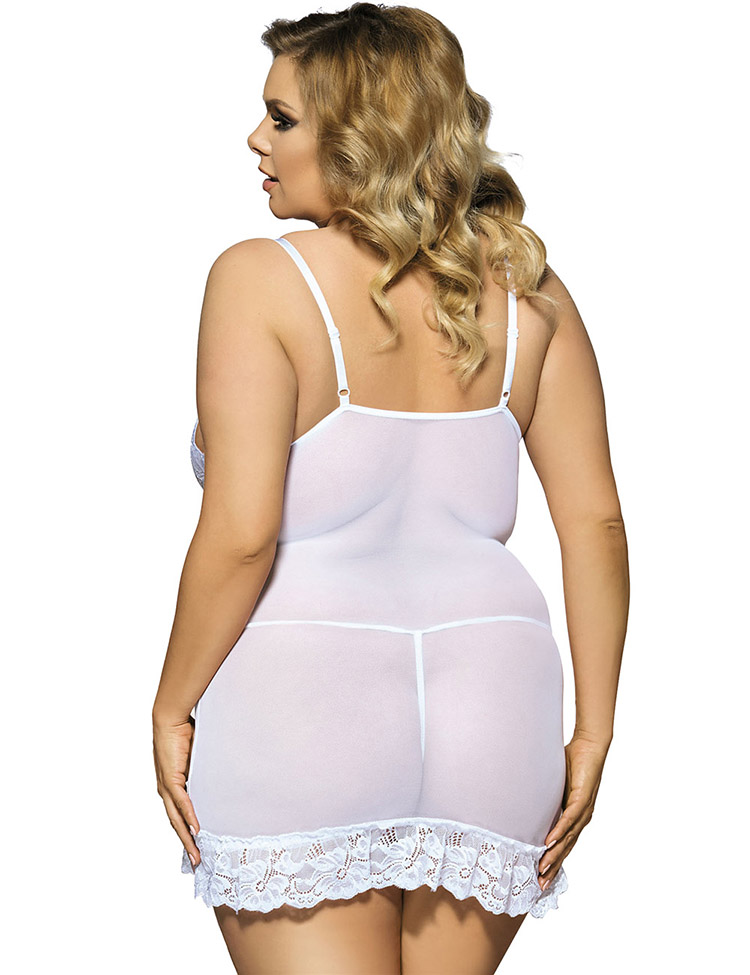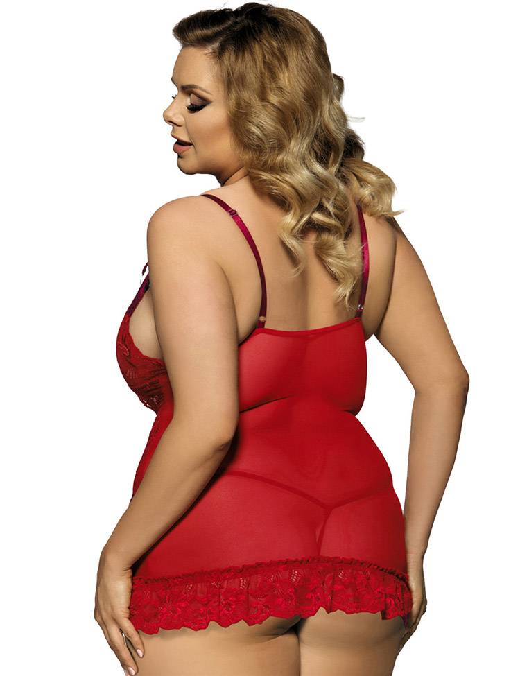 The plus size flirty lace babydoll features a lace front with ruffle trim, mesh back, a satin bow and matching thong.