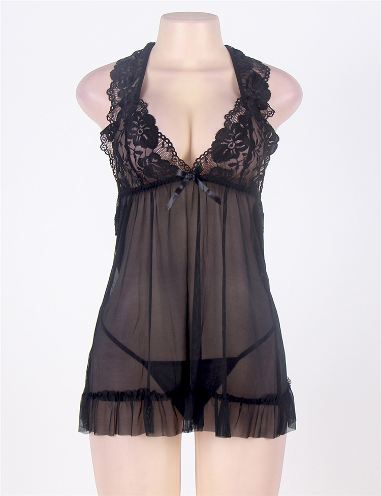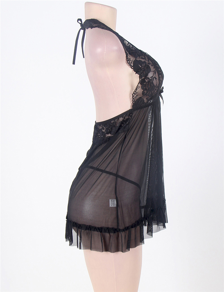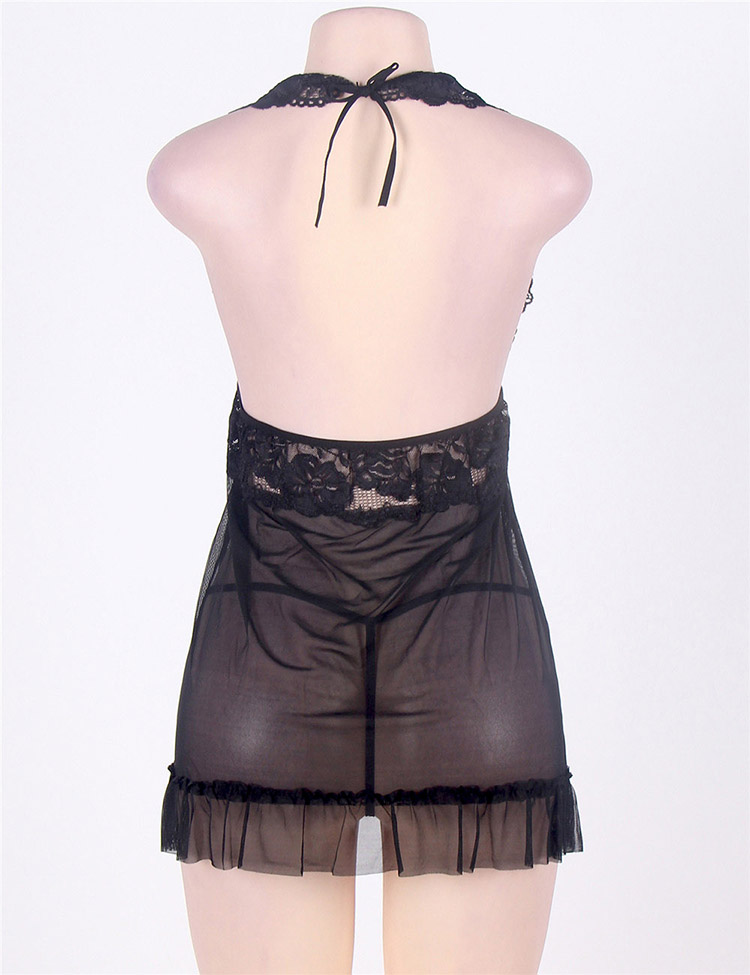This plus size lace halter babydoll includes the full figured babydoll with ruffle hem and adjustable neck straps and the matching g-string.