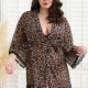Make a bold statement with this eye-catching plus-size lingerie set featuring a daring leopard print design. The sheer mesh bralette with a front tie accent highlights your curves, while the matching thong offers a sleek silhouette. Paired with a flowing open-front robe that drapes gracefully, this set blends confidence and charm—perfect for adding a touch of wild flair to your intimate wardrobe.