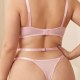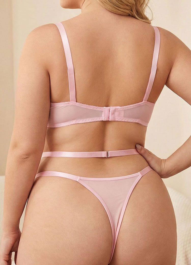 Embrace a soft and romantic aesthetic with this beautiful plus-size lingerie set. The delicate light pink color is adorned with intricate floral lace embroidery in complementary shades of pink and blue, creating a dreamy and feminine look. The soft bra features a charming strappy design and scalloped lace trim, while the matching thong and garter straps complete this alluring three-piece set, perfect for a special night in.