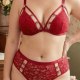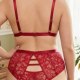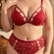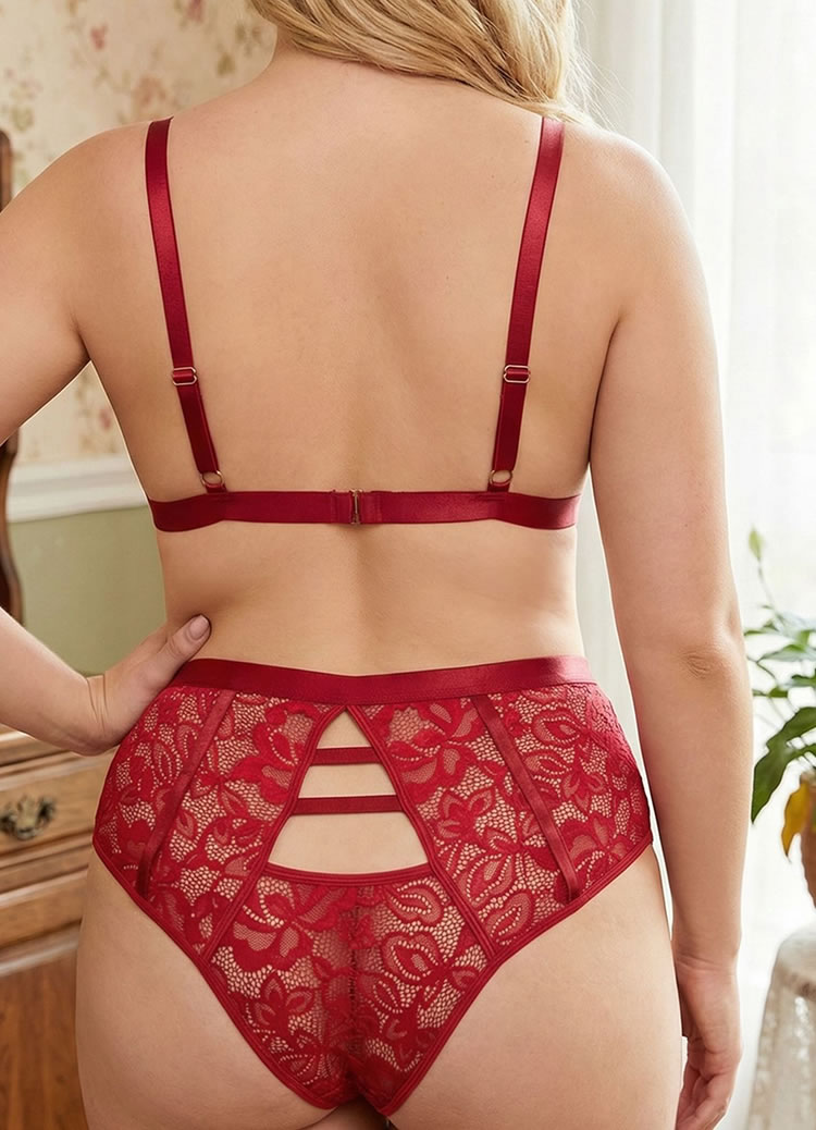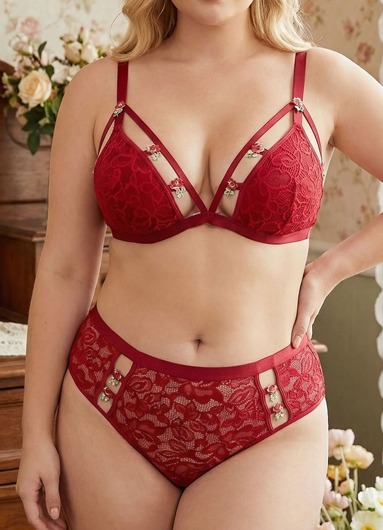 Ignite a spark with this bold and romantic red lingerie set. Designed for the plus-size figure, it features a bralette-style top crafted from intricate floral lace. The design is detailed with charming 3D rosebud embellishments along the strappy cups, adding a touch of whimsy. The matching high-waist panties feature similar lace and rosebud details on the front, while the back reveals a flirty cut-out design with multiple straps for a captivating look from every angle.