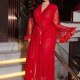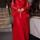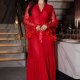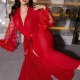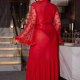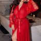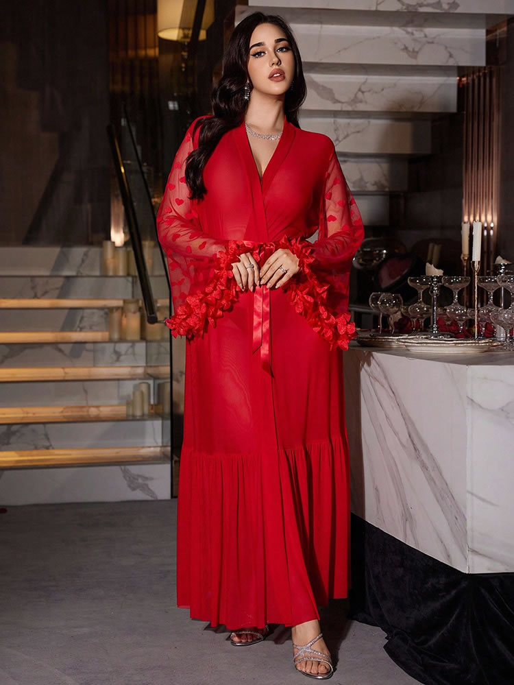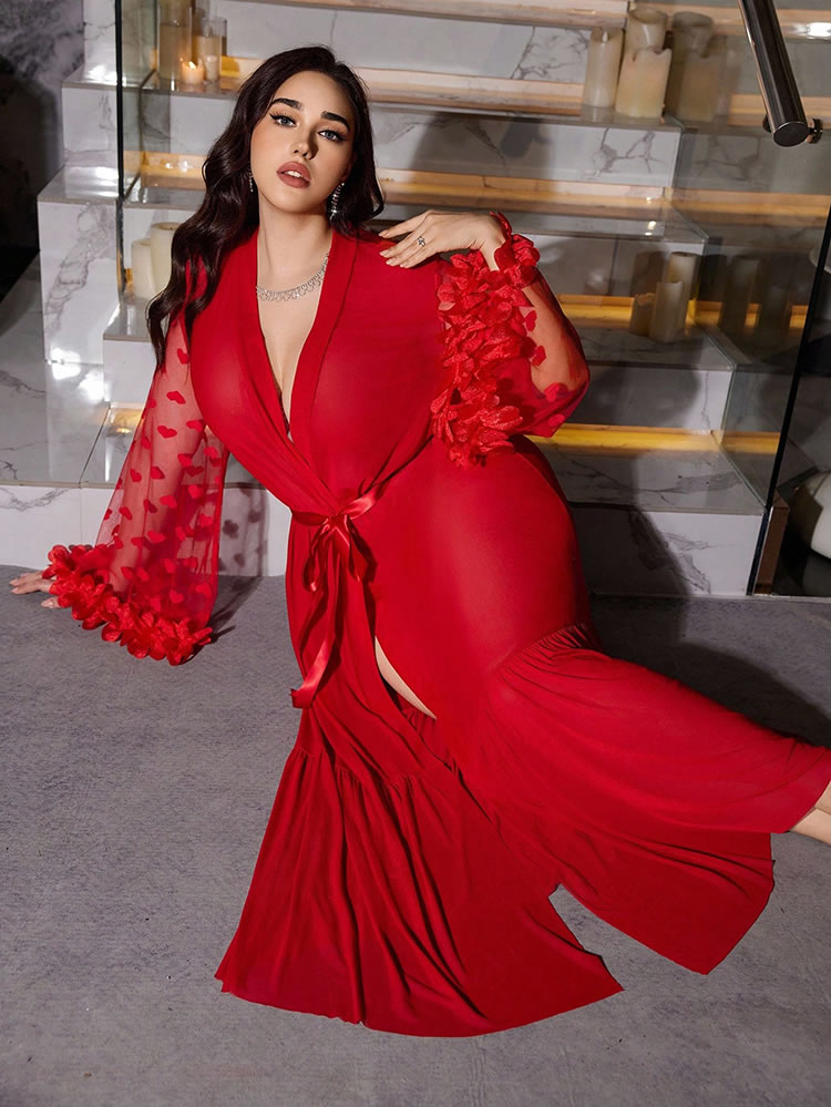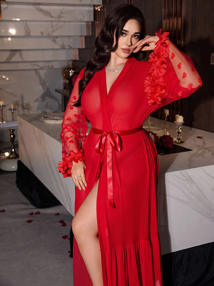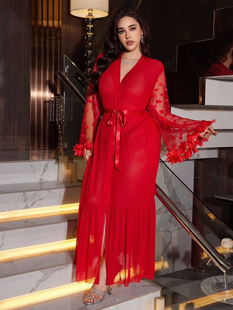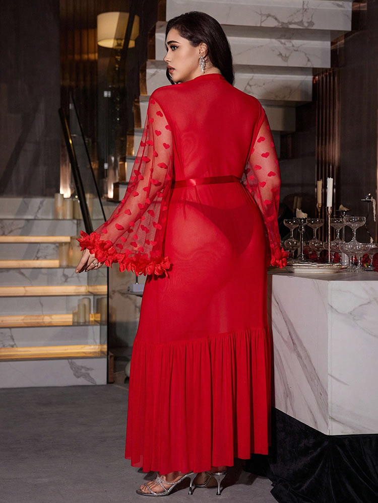This plus-size red robe features a flowing silhouette with sheer sleeves adorned with heart-shaped details and floral ruffle trim at the cuffs. The deep V-neckline and wrap-style front create a flattering look, while the soft fabric drapes beautifully over the body. Designed with comfort in mind, it includes a matching belt to define the waist and a pleated hem that adds movement. Perfect for wearing at home or as a statement piece for special occasions.