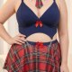 Embrace a playful and rebellious spirit with this plus-size lingerie set, inspired by a classic schoolgirl aesthetic. The ensemble features a navy blue crop top with a deep V-neckline, accented by a small red bow at the center. It is paired with a vibrant red plaid pleated mini-skirt, complete with a matching plaid tie-neck accessory and a decorative silver chain belt with a red bow. This fun and flirty set is designed to be both comfortable and eye-catching.
