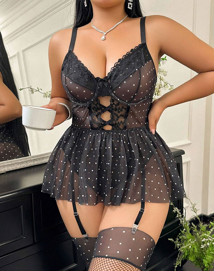 This plus-size black polka dot lingerie set blends bold design with flattering fit. The babydoll silhouette features a lace-trimmed bustier with structured support and a crisscross front detail that adds visual interest. A flared mesh skirt creates soft movement, while the attached garter straps keep thigh-highs securely in place. Designed for full figures, it offers both comfort and confidence with an open back and adjustable straps for a customized feel.
