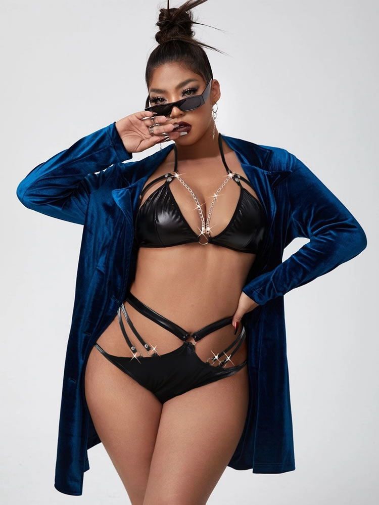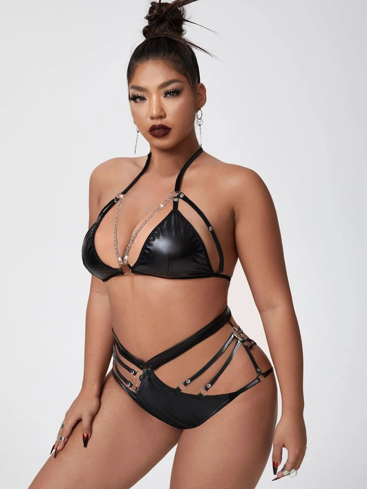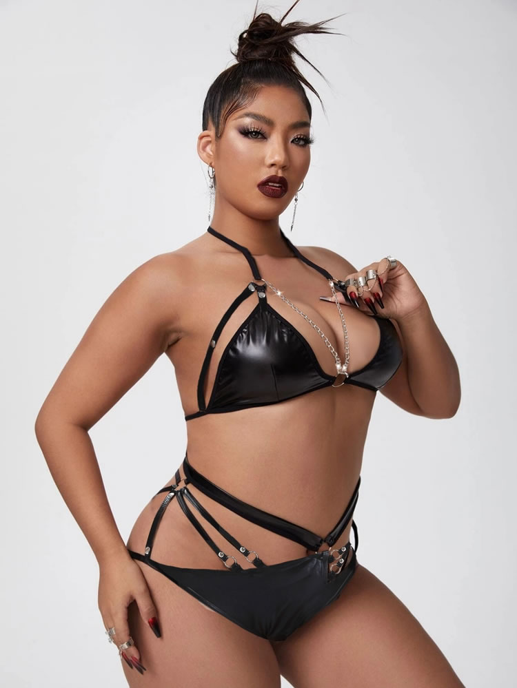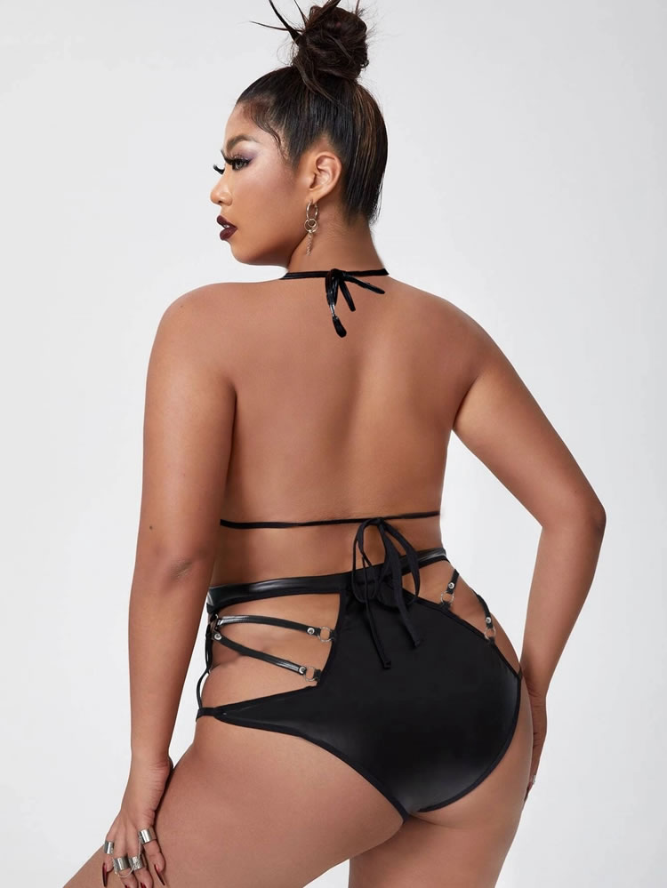 Tempt and tease in this ultra sexy plus size bra set featuring wet look cups with strappy detailing, metal O-ring accents, halter straps, a tie back closure, and a matching strappy panty with a high waist, O-ring accents, and a cheeky cut back.