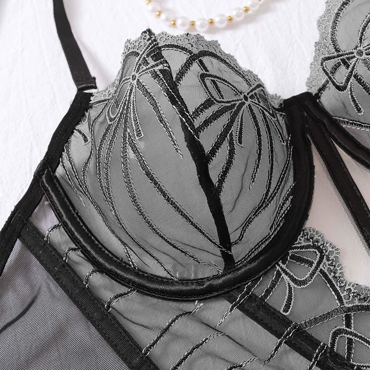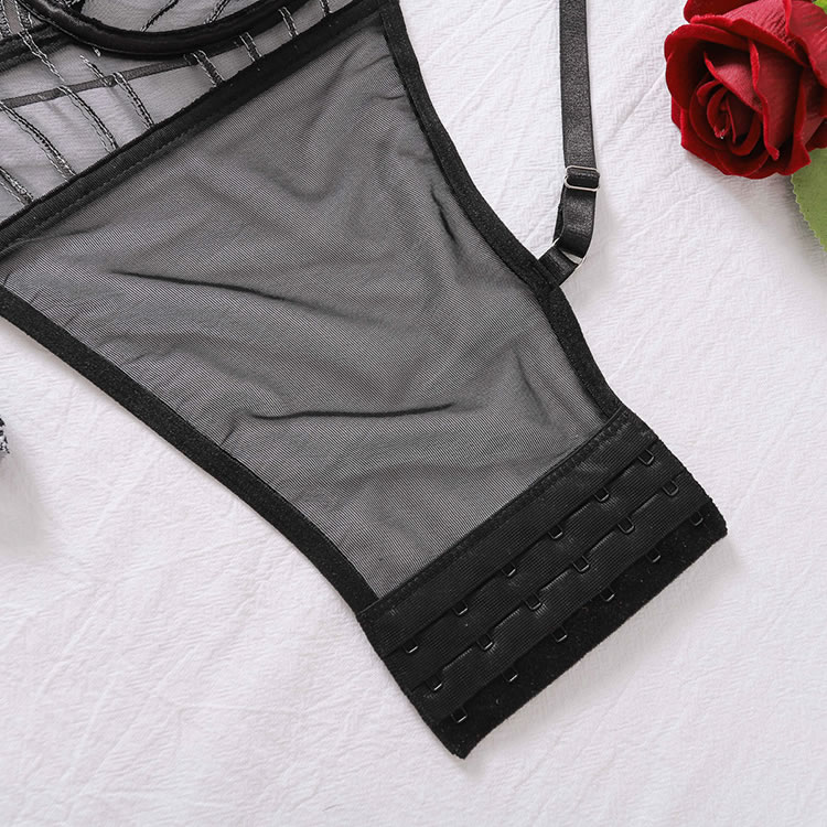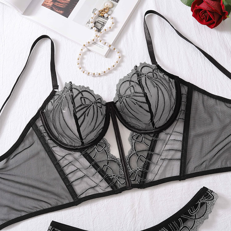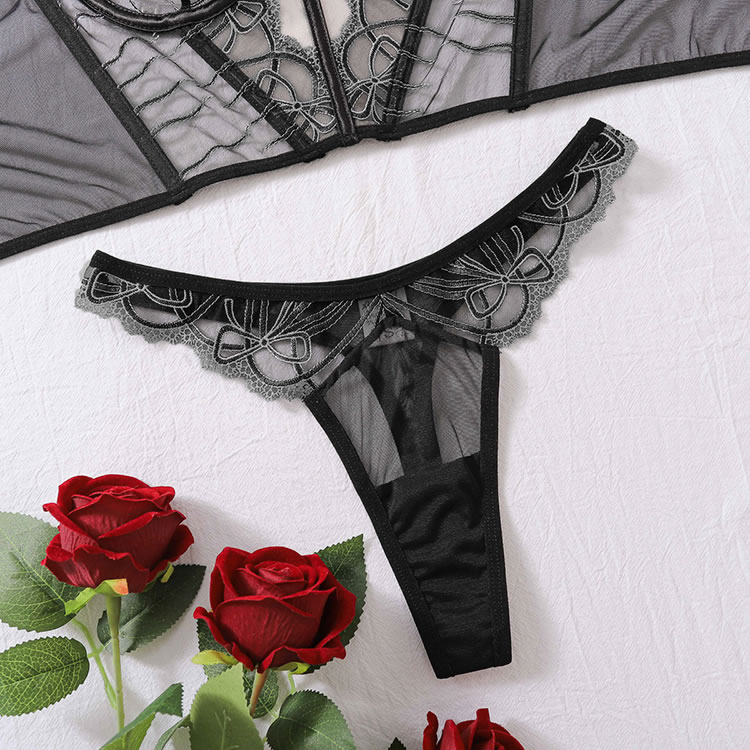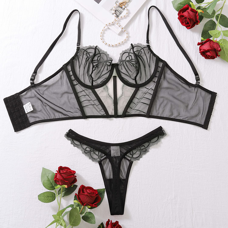 Ignite romance in this seductive bra set featuring sheer mesh underwire cups with delicate embroidery, adjustable spaghetti straps, and a longline lace underbust. The set is finished with a hook and eye back closure and a matching thong cut panty, perfect for a night of passion.