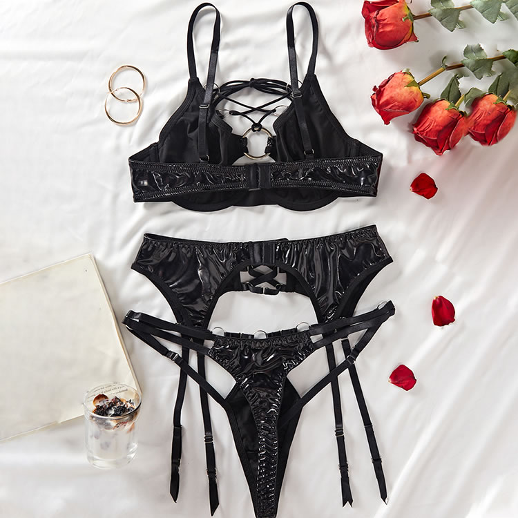 Elevate your intimate style with this seductive patent leather lingerie set. The bra features a strappy design with central rings, adding an edgy and bold touch. The high-waisted garter complements the bra with its intricate strap detailing, creating a cohesive and alluring look.