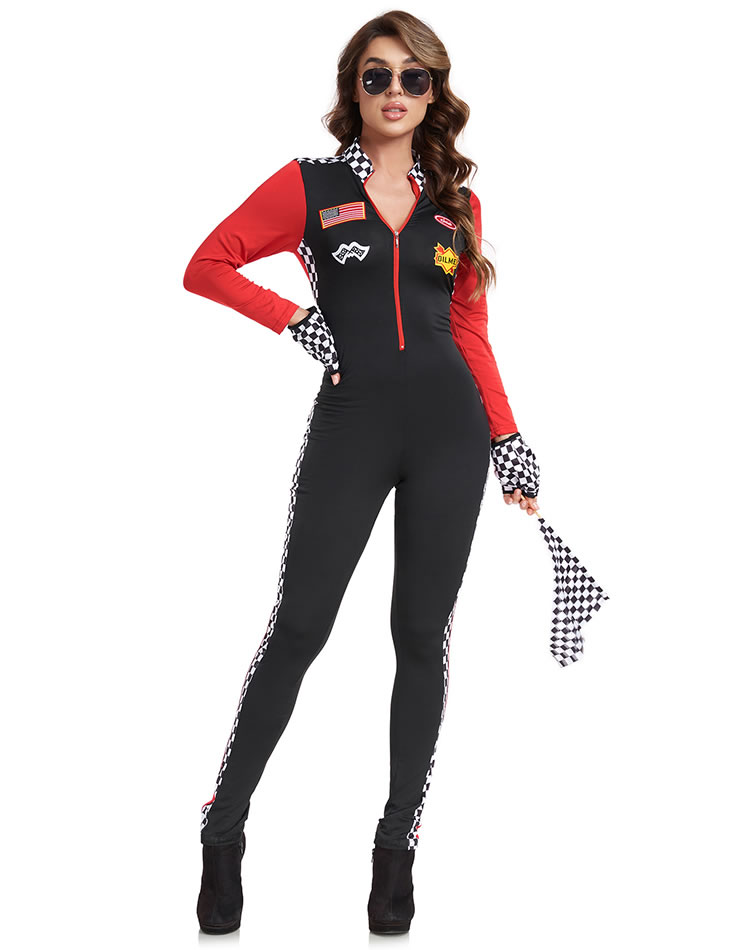 Channel your inner pit crew star in this dynamic racing suit costume. Featuring a tight-fit design with a high collar and long sleeves, it combines black fabric with vibrant red accents and classic checkered detailing down the legs. The front zip closure and printed sponsor-style logos give it a realistic motorsport vibe. Whether you're cheering on the racers or stealing the spotlight, this ensemble delivers bold energy and confidence. ( Checkered flag not included )