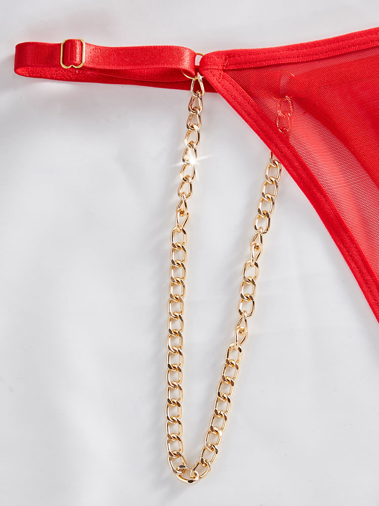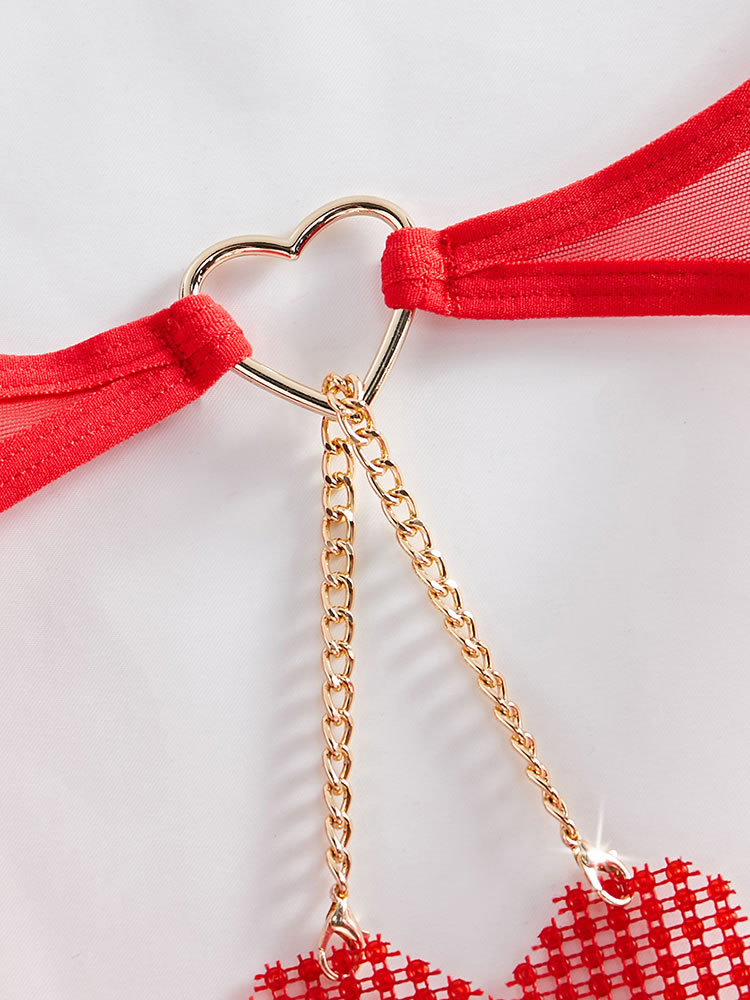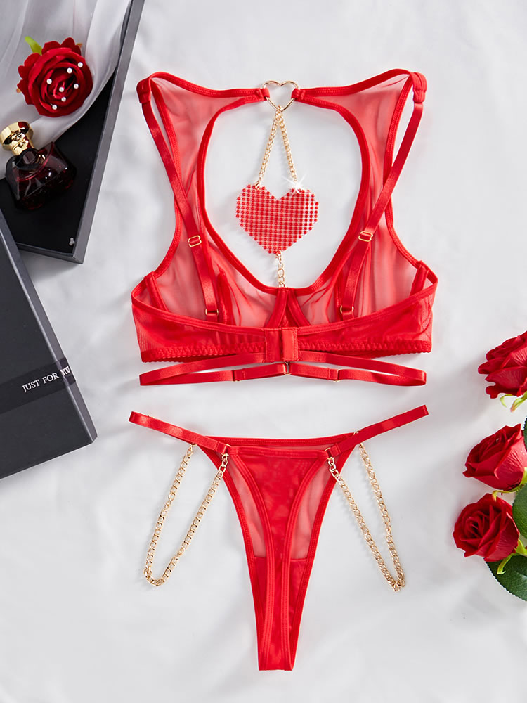 Highlight your gorgeous physique in this sexy bra set featuring sheer lace underwire cups, a front keyhole opening with heart charm embellishment, adjustable spaghetti straps, a hook and eye back closure, and a matching thong panty.