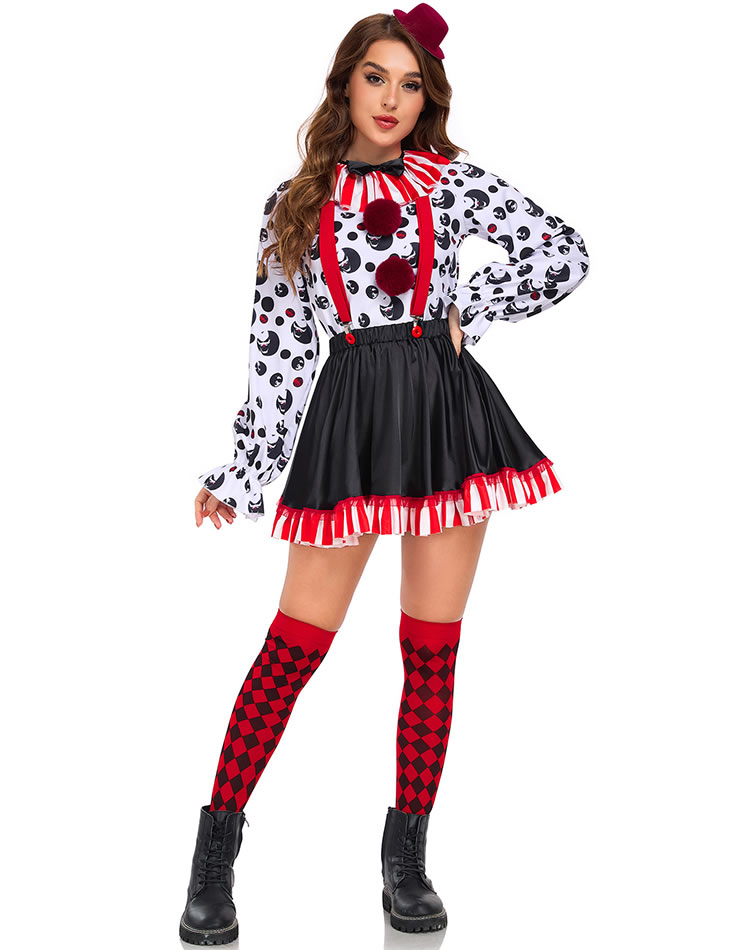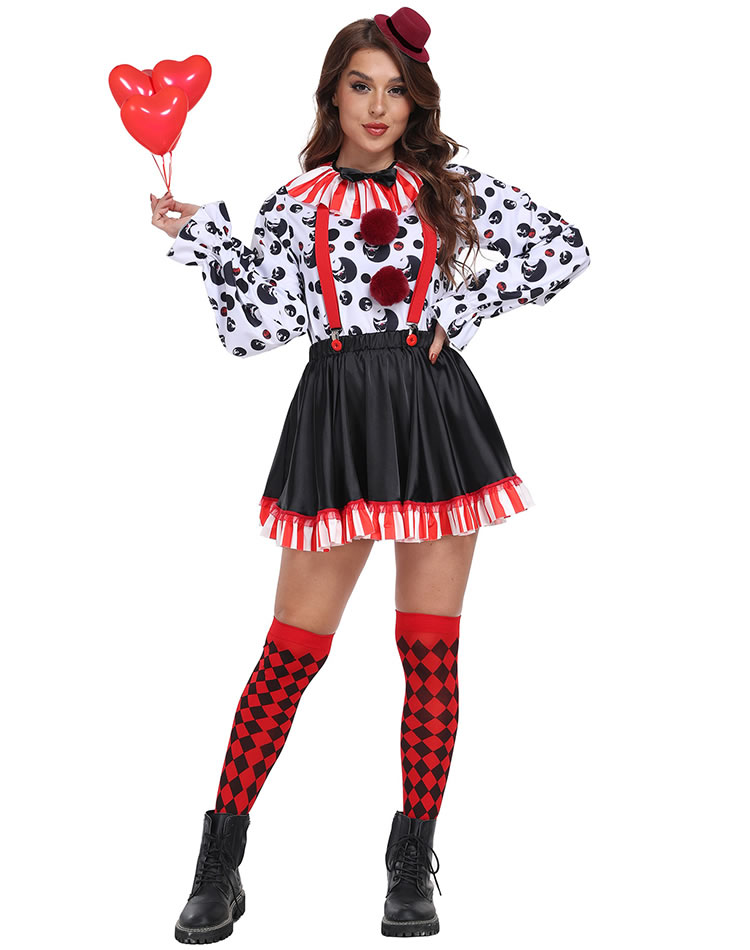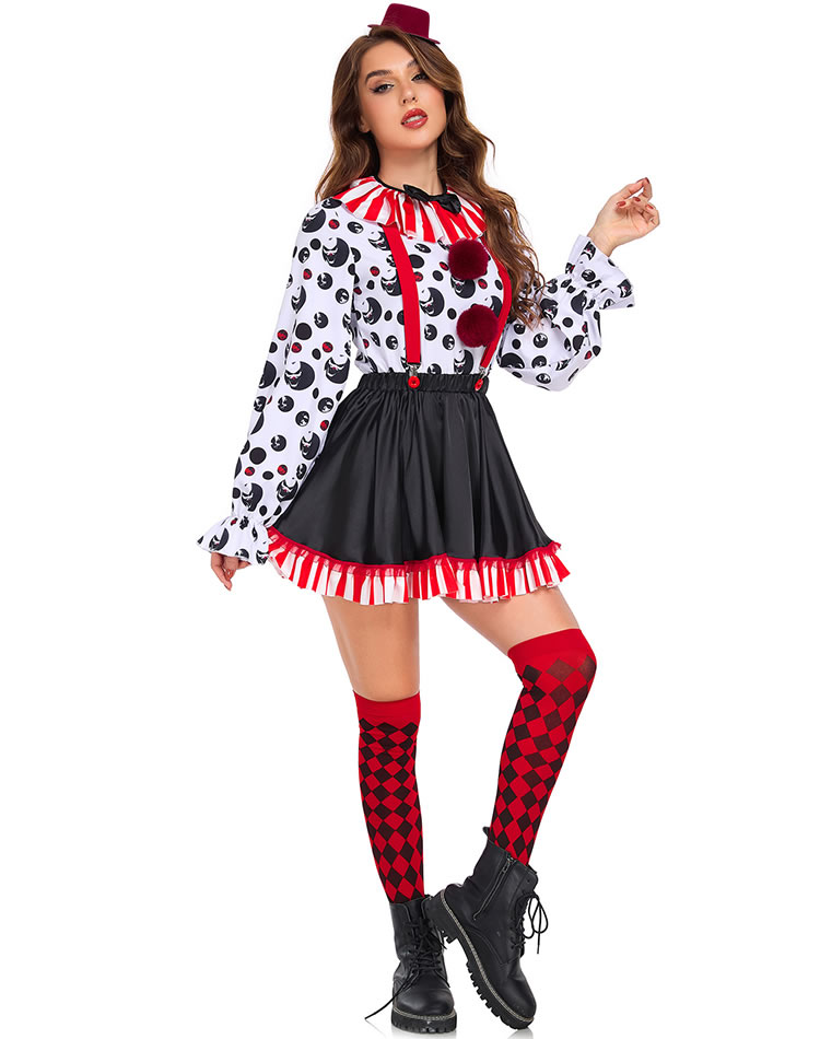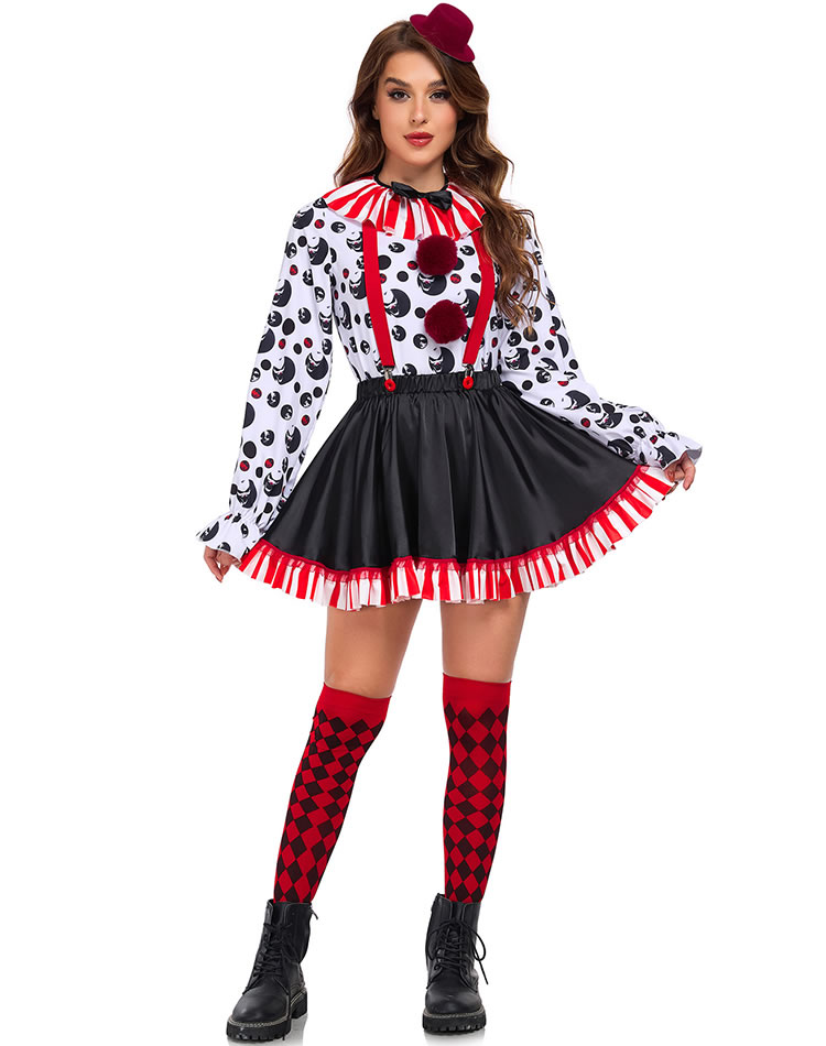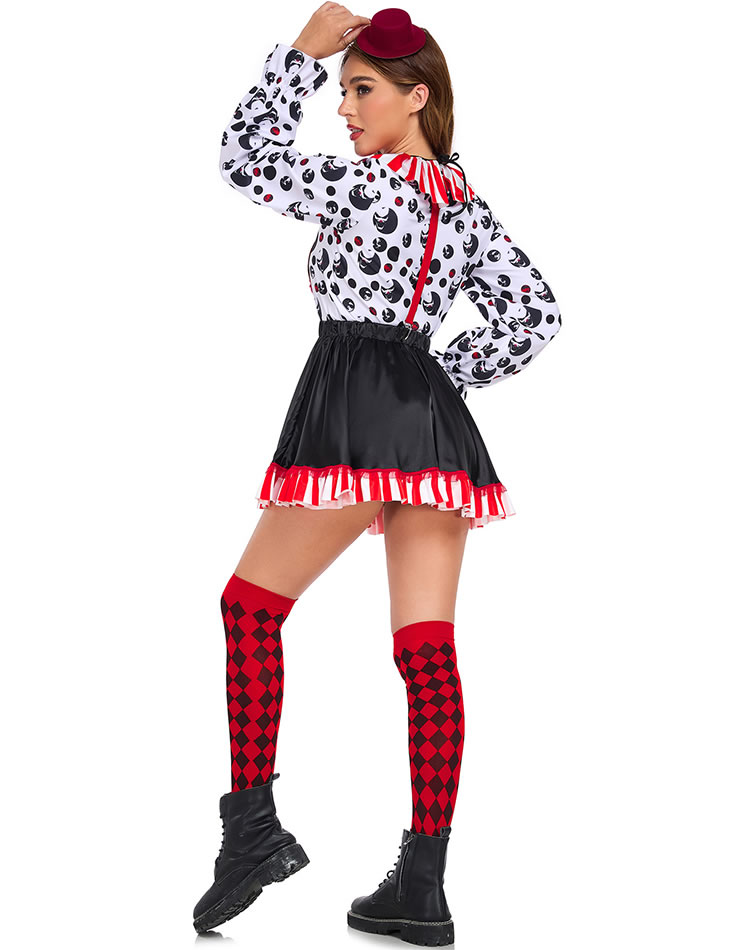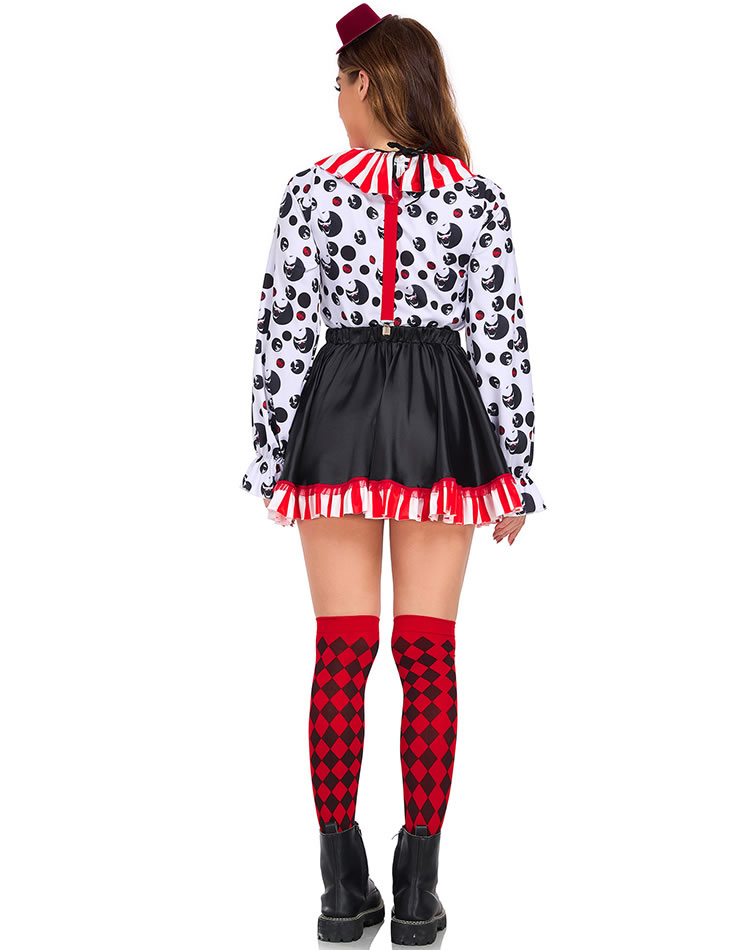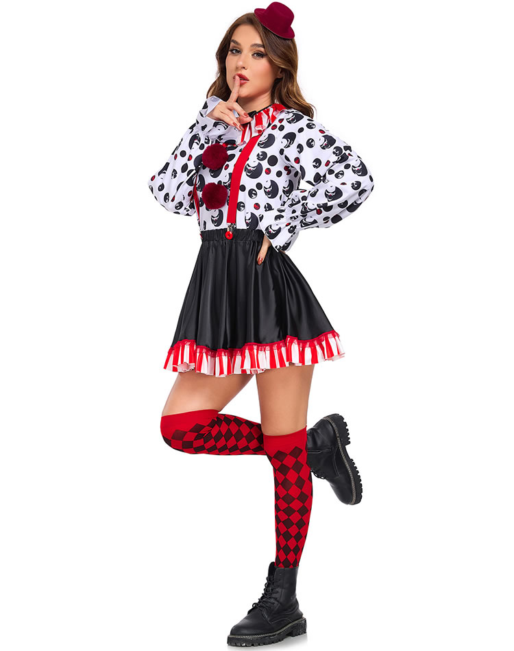Step into the spotlight with this playful and eye-catching clown-inspired costume, featuring a long-sleeve shirt printed with whimsical black moon and dot patterns on a white background. The outfit includes a flared black skirt with red-and-white striped trim, red suspenders for added charm. It’s perfect for Halloween, themed parties, or theatrical performances. (Knee-high socks and a tiny red hat not included.)