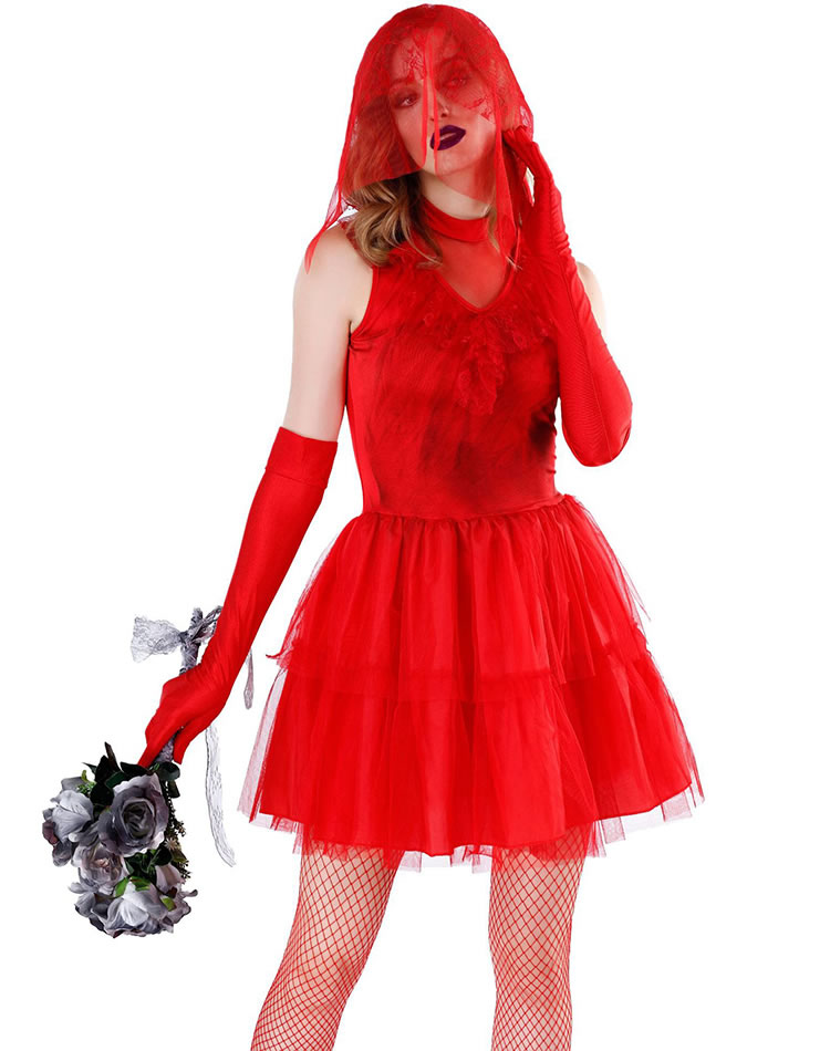 Make a striking statement with this bold red bride costume that turns traditional wedding attire into a daring fashion statement. Featuring a fitted bodice with a high neck and deep V-cut, it's paired with a flirty layered tulle skirt that adds playful volume. The ensemble includes a matching red lace veil, long gloves. Perfect for Halloween, themed parties, or cosplay, this outfit blends romance with rebellion. ( Fishnet stockings not included)