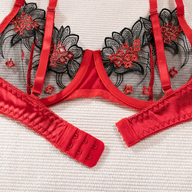 Be your lover's favorite bouquet in this sultry bra set featuring sheer mesh underwire cups with floral embroidery, adjustable spaghetti straps, a hook and eye back closure, and a matching thong.