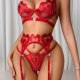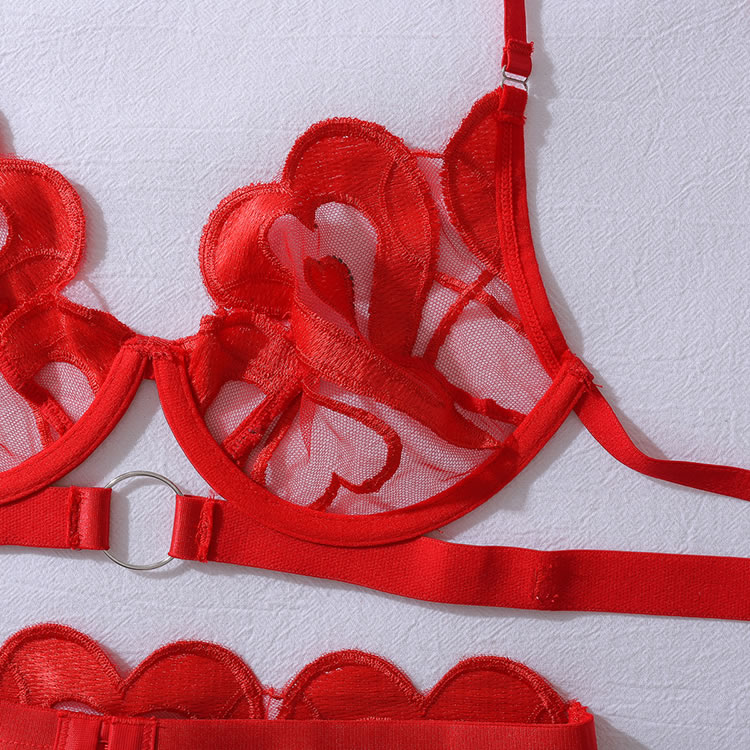 Make a bold and playful statement with this eye-catching red lingerie set featuring heart-shaped lace details throughout. The bra showcases sheer mesh panels framed by embroidered hearts, while the matching thong and garter straps continue the romantic theme with layered designs and delicate cutouts. Designed for confidence and flair, this ensemble combines structured support with daring transparency, perfect for special occasions or intimate moments where you want to express passion and personality.