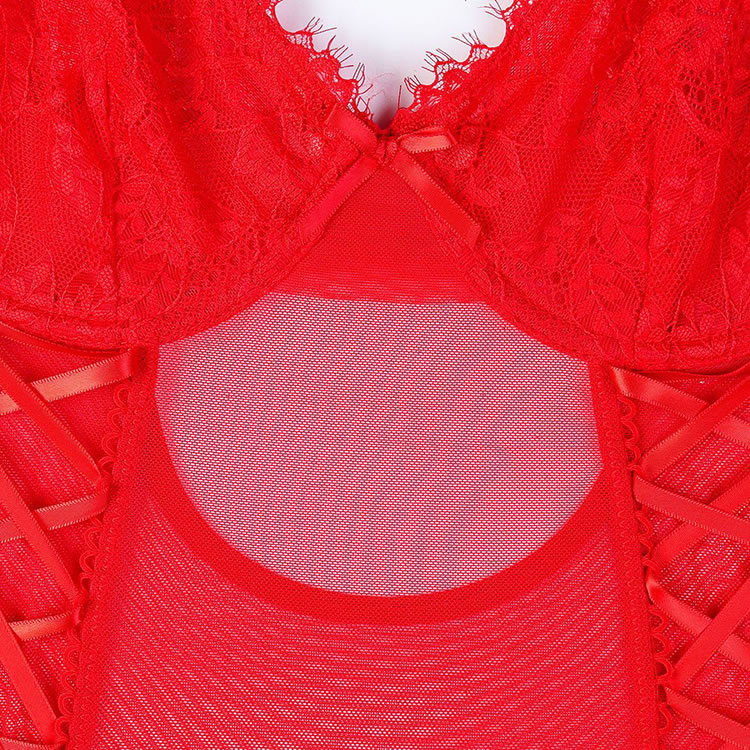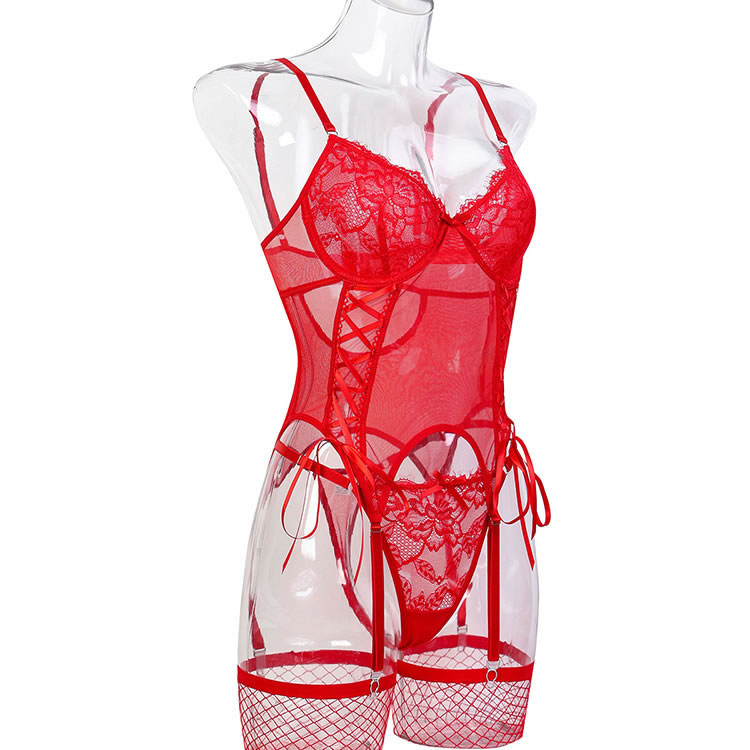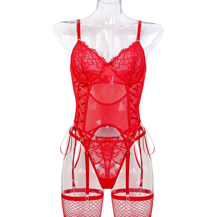 The chemises set offers a plunging neckline and supportive underwire cups, beautifully adorned with lace motifs. The adjustable straps and back closure ensure a comfortable fit. The coordinating g-string and garter belt complete the set, allowing you to showcase your legs with confidence. The red mesh stockings feature a seamless design for a sleek look.