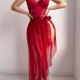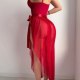 This bold red lingerie set combines romance and drama with a sleek bodysuit and flowing sheer skirt. The structured bustier top features delicate lace trim and decorative bow details that add a sweet touch to the silhouette. Paired with a high-slit, asymmetrical chiffon drape tied at the waist, it creates a sultry look that’s perfect for making an impression. Whether worn alone or layered, this ensemble blends confidence and elegance in one unforgettable piece.