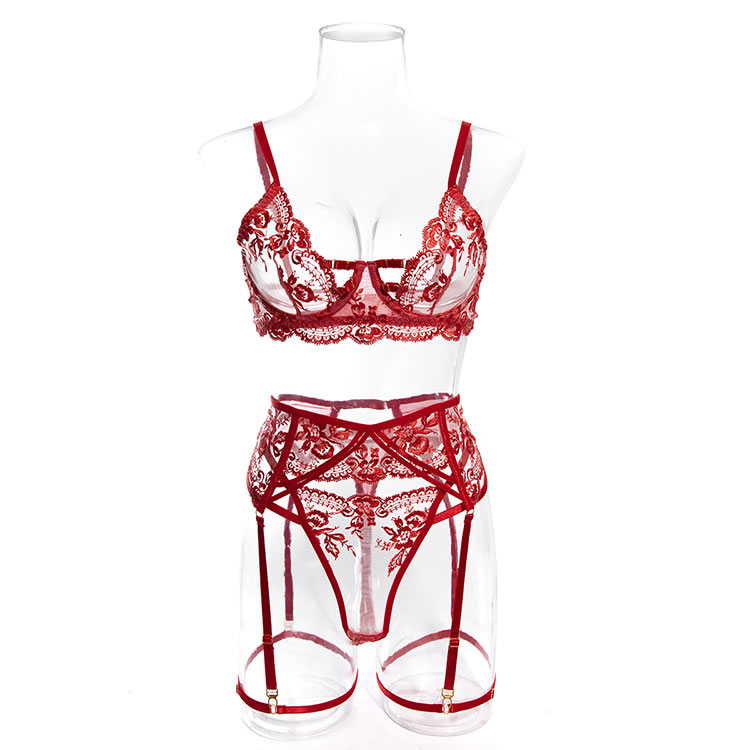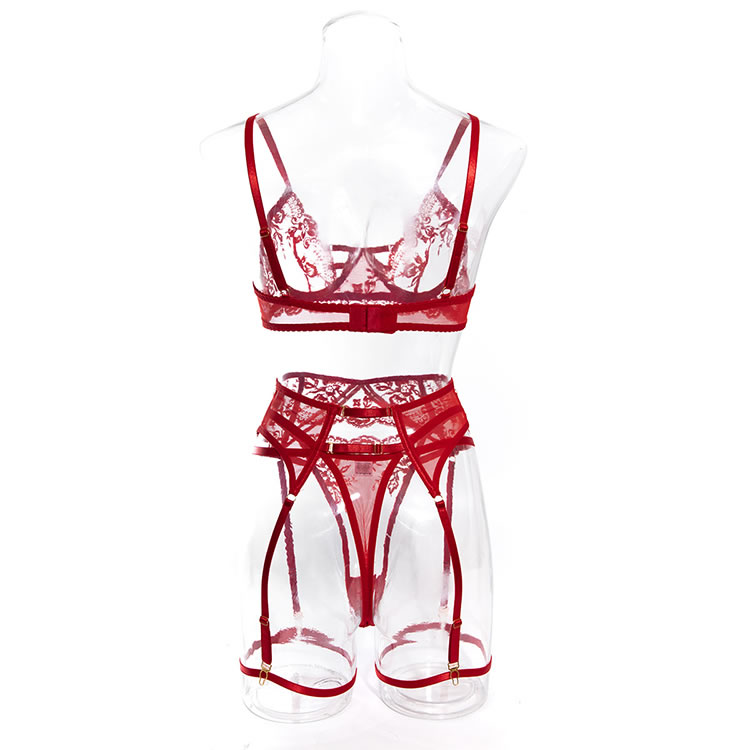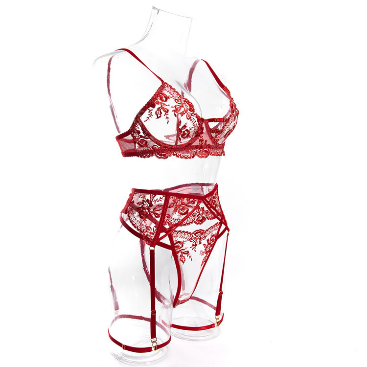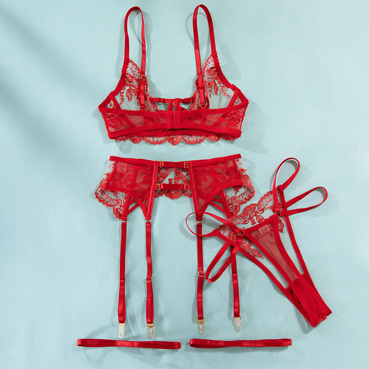 This striking red lingerie set features intricate lace detailing and bold garters that add a touch of allure and confidence. The sheer fabric with delicate embroidery creates a visually captivating effect, while the comfortable fit ensures all-day wearability. Perfect for making a statement in your intimates.