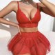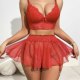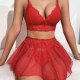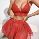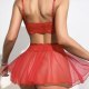 This vibrant red lingerie set combines a structured lace bra with a flirty tulle mini skirt for a look that’s both romantic and daring. The soft lace bra features scalloped edges, delicate floral lace detailing, and a bow accent at the center, offering support and style. Paired with a sheer, sexy tulle skirt that flares softly around the hips, it adds a whimsical touch to your intimate wardrobe. Designed with thin adjustable straps and garter-style side ties, this set blends vintage charm with modern flair—perfect for those who love to play with texture and silhouette.