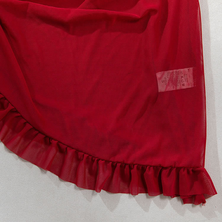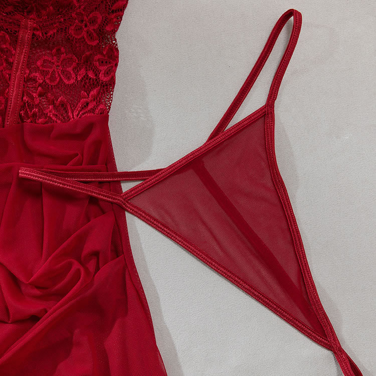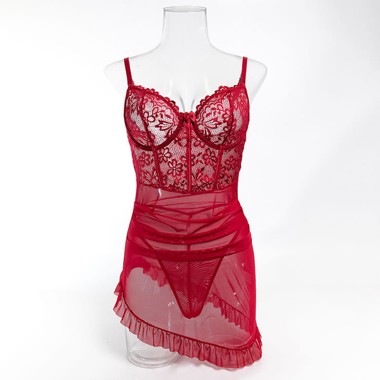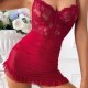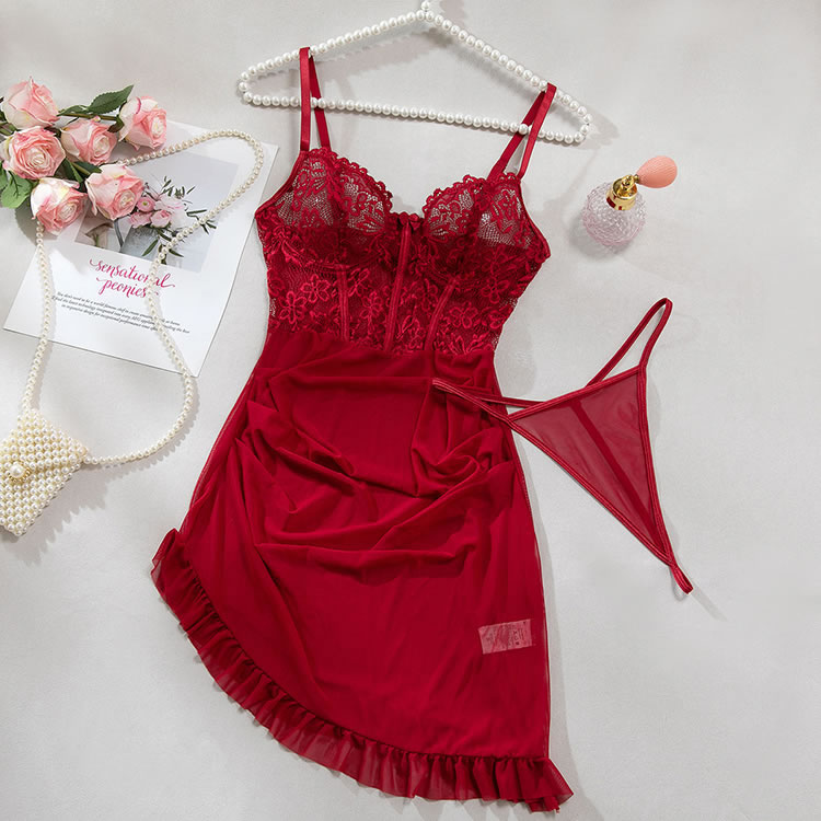 This bold red lingerie dress features a captivating lace bodice with floral patterns and a structured design that accentuates the bust. The top is paired with a smooth, form-fitting skirt that drapes elegantly over the hips, finished with a playful ruffled hem. Thin adjustable straps add comfort and style, while the back offers a clean, minimalist look. Perfect for making a statement in intimate settings.