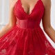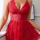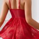 This bold red lingerie dress combines a deep V-neckline with intricate floral lace detailing across the bodice and flared skirt. The fitted corset-style waist features a satin bow at the center, adding a romantic touch, while thin adjustable straps provide comfort and support. The full, flowing lace skirt creates a playful silhouette, making it ideal for those who enjoy a blend of drama and charm. Designed to make a statement, this one-piece offers both structure and softness in equal measure.