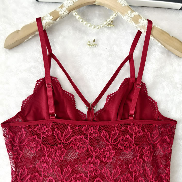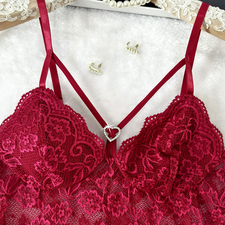 This exquisite lingerie features a stunning deep red hue with intricate lace detailing that adds a touch of romance and allure. The delicate straps and heart-shaped embellishment at the center create a captivating focal point, while the soft fabric ensures ultimate comfort for a perfect night's sleep.
