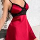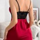 This red lingerie dress features a smooth, satin-like fabric with a deep V-neckline and black lace trim along the bust. The bra-style top includes a small bow detail at the center, while the fitted waist flows into a flared skirt that adds movement and charm. Thin adjustable straps complete the look, offering both comfort and style for intimate moments.