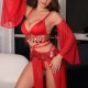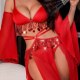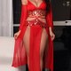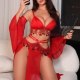 This striking red lingerie set features a deep V-neck bra paired with a high-cut thong, both accentuated by shimmering fringe details that add movement and sparkle. The matching sheer robe flows elegantly with wide sleeves and a high slit, offering both coverage and allure. Designed to command attention, the outfit combines bold color with sensual cutouts and delicate embellishments. Whether worn for a special evening or as a confident statement piece, this ensemble blends romance with edgy charm.