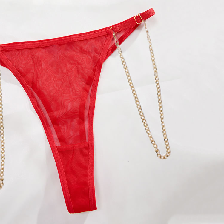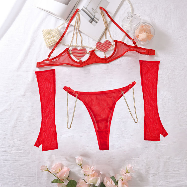 This striking red lingerie set delivers a bold statement with its daring design and eye-catching details. The bra features a unique chain-strap construction that extends from the cups to the shoulders, adorned with sparkling rhinestones that catch the light. The heart-shaped cups are covered in glittering embellishments, adding glamour and flair. Paired with a minimalist thong and matching long mesh gloves, it’s a look built for confidence and drama. Designed to turn heads, this ensemble blends vintage inspiration with modern edge for a truly unforgettable vibe.