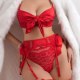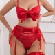 Elevate your intimate style with this bold and alluring red lingerie set, designed to captivate with its elegant silhouette and playful details. Featuring a satin bow-adorned bra with delicate lace trim and adjustable straps, it offers both comfort and flair. The matching high-cut briefs are crafted from sheer lace. Garter belt with side ties that accentuate the waistline, while detachable garters with charming bows add a touch of vintage charm. Perfect for making a statement, this ensemble blends romance and confidence in every curve.