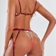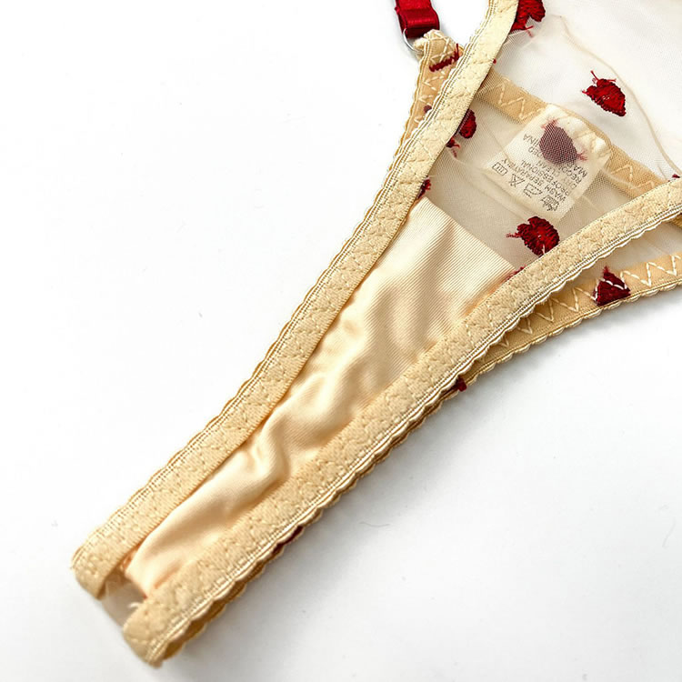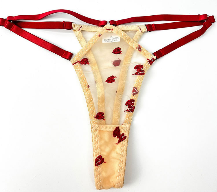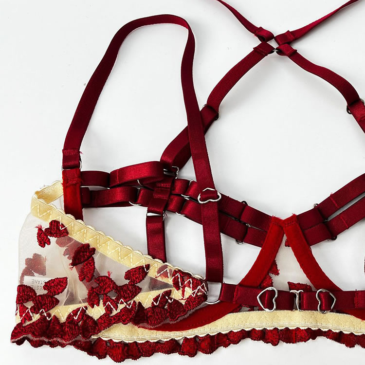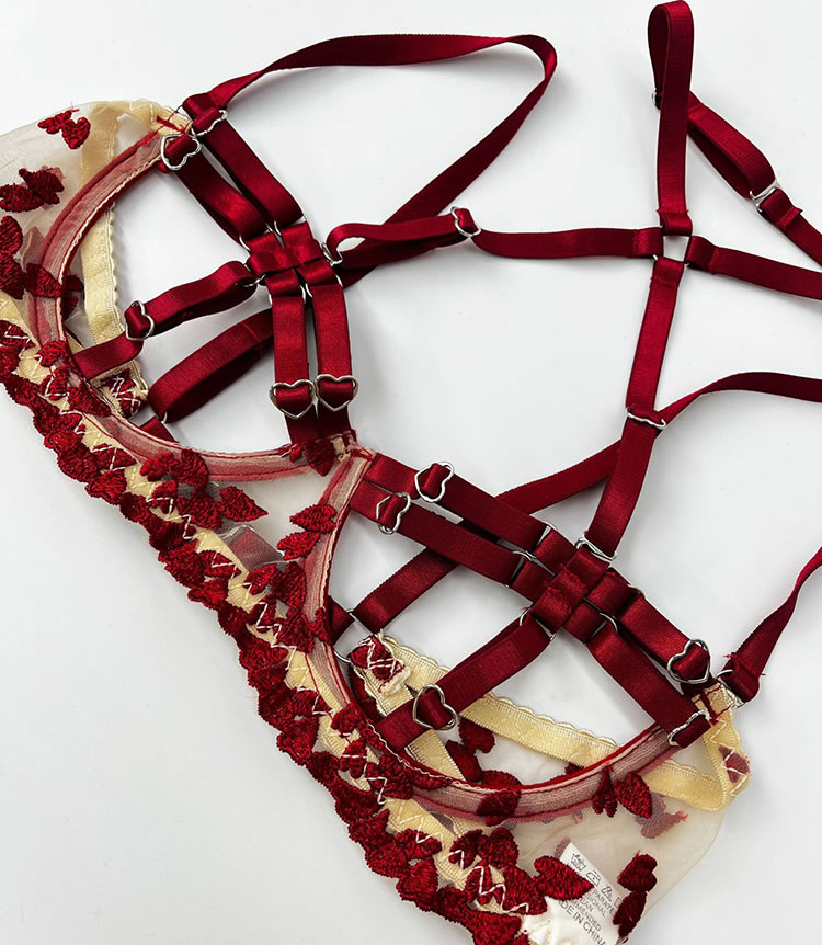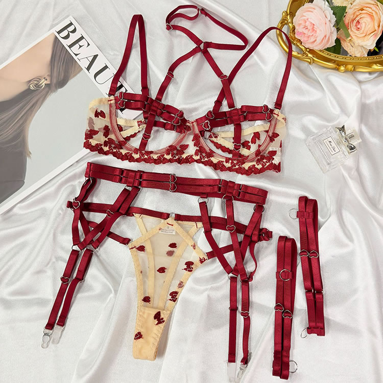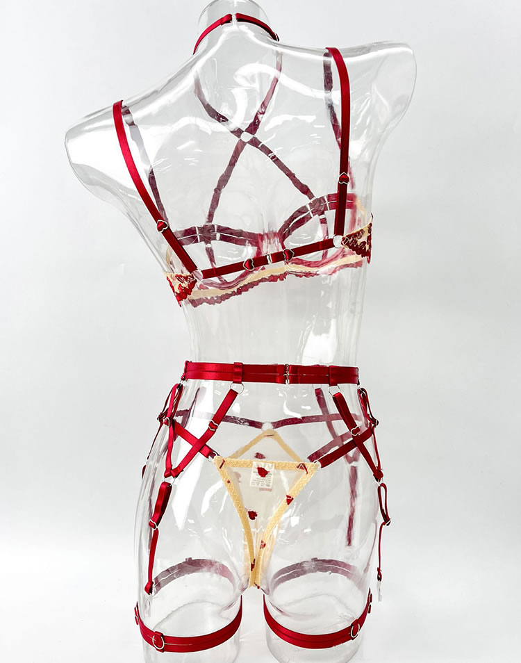This bold red lingerie set features a structured bra with multiple straps and metal hardware for a dramatic look. The design includes lace detailing along the edges, adding texture to the silhouette. The matching garter belt connects to thigh straps with adjustable clips, allowing for a customized fit. Paired with a sheer thong that has subtle heart accents, this ensemble is made for those who enjoy expressive and eye-catching styles.