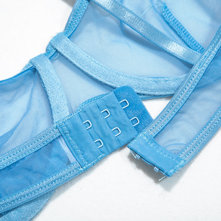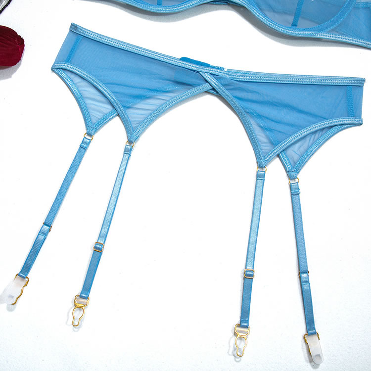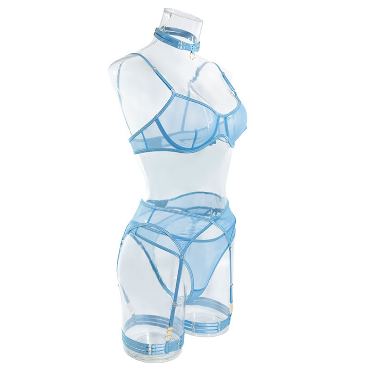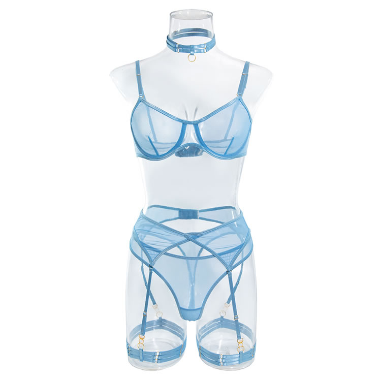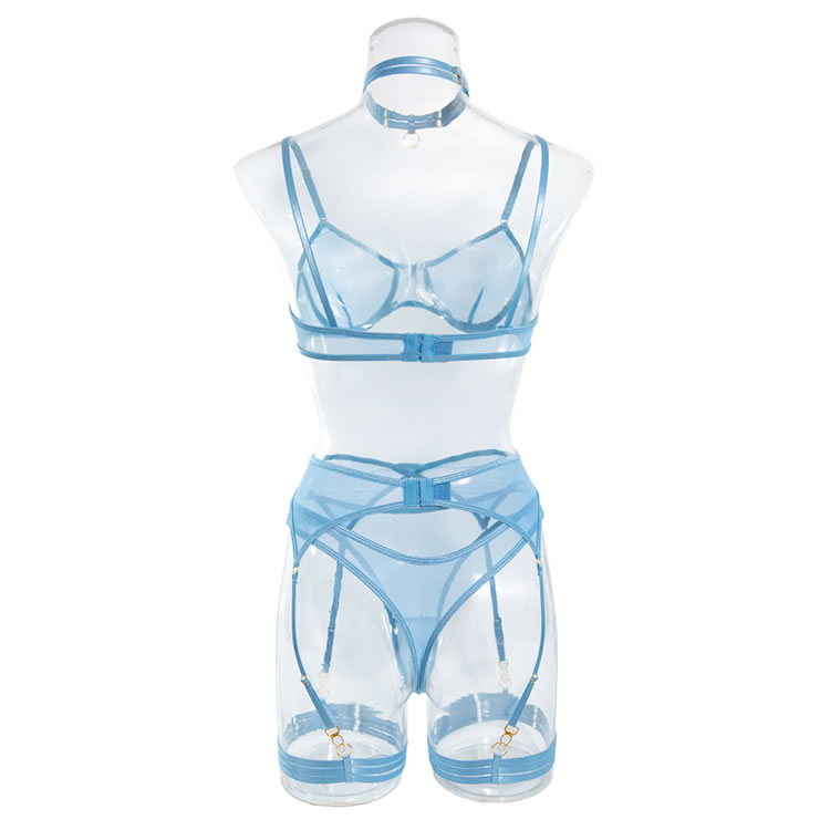 Highlight your sexiest features in this flirty bra set featuring sheer mesh underwire cups, adjustable spaghetti straps, a hook and eye back closure, a matching panty with a cheeky cut back, and a matching high waisted garter belt with a hook and eye back closure, and adjustable garter straps, wraparound leg garters. (Choker included.)