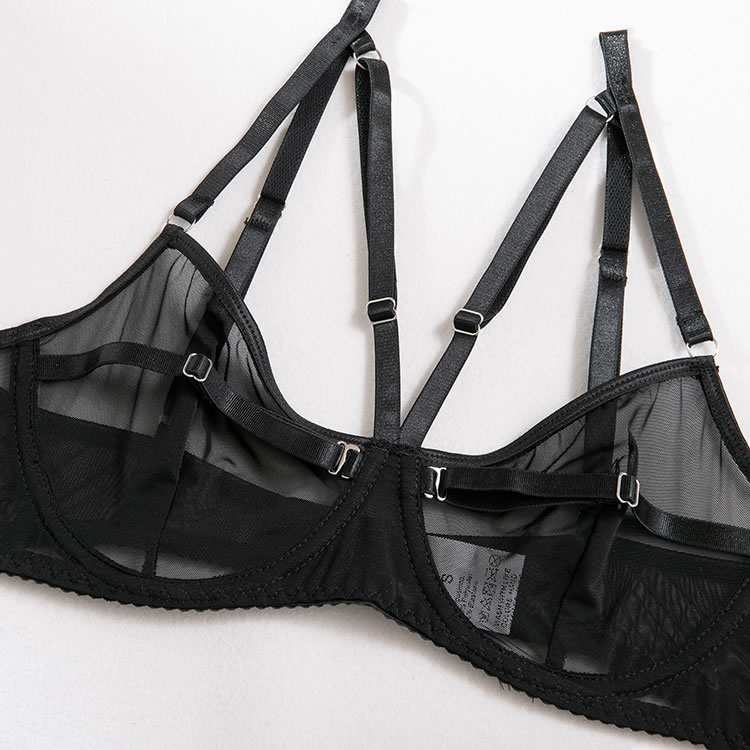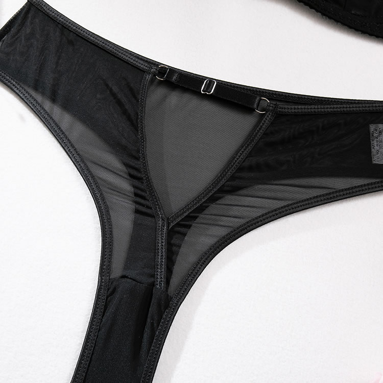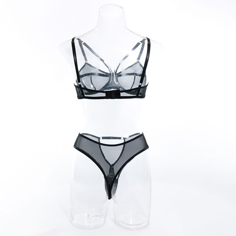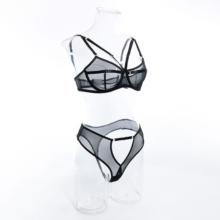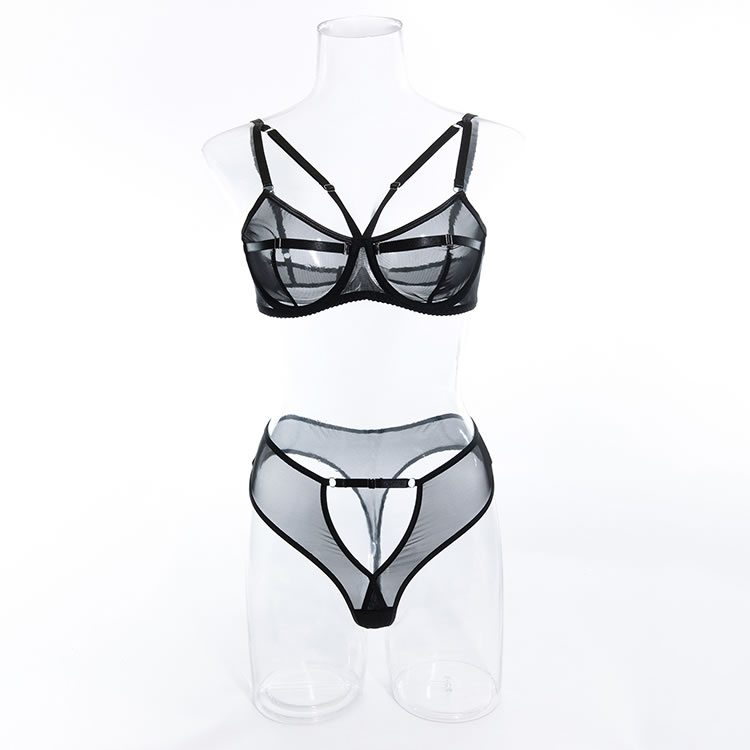 Your babe will have all their attention on you in this exclusive bra set featuring sheer mesh cups with strappy detailing, adjustable spaghetti straps, hook and eye back closure, and a matching high waisted panty with keyhole openings, and a thong cut back.