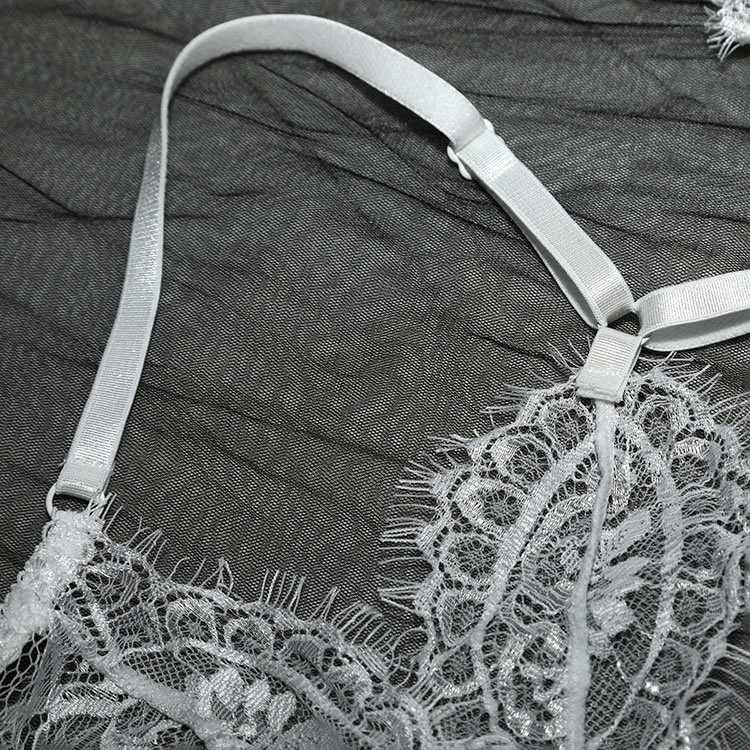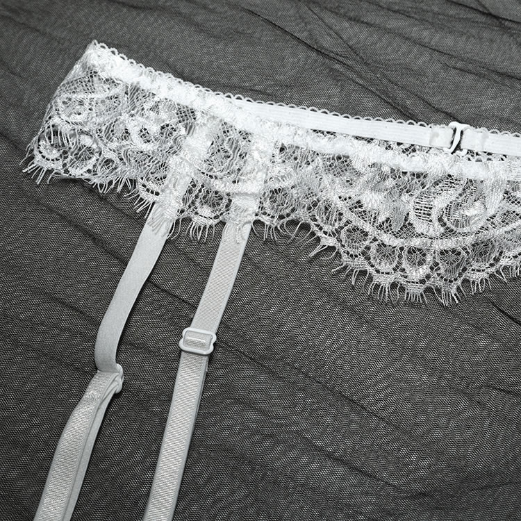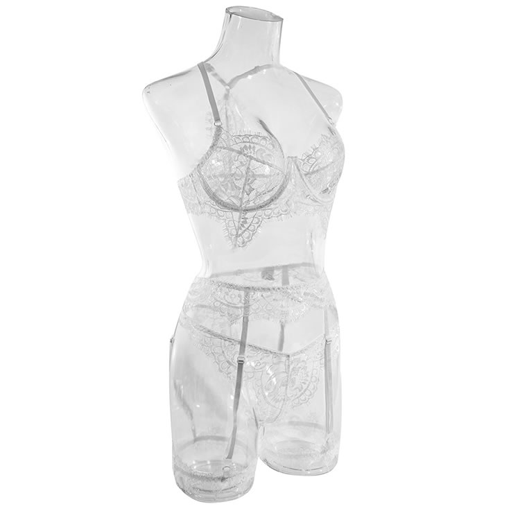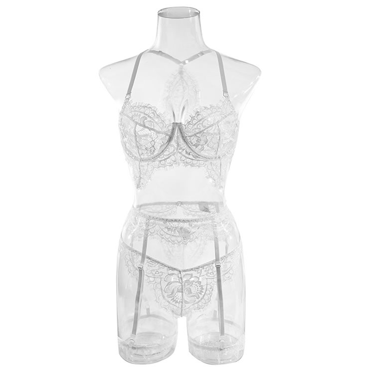 Have your honey longing for you in this gorgeous exclusive floral lace bra set featuring sheer lace underwire cups, adjustable spaghetti straps, a racerback, a matching garter belt with adjustable garter straps, wraparound leg garters, and a matching panty.