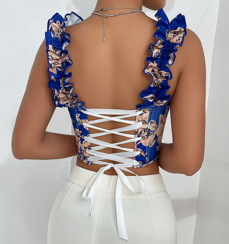 Embrace a romantic vibe with this floral bustier top. The deep blue background is beautifully contrasted with a soft floral print, and the ruffled straps add a whimsical touch to the design.