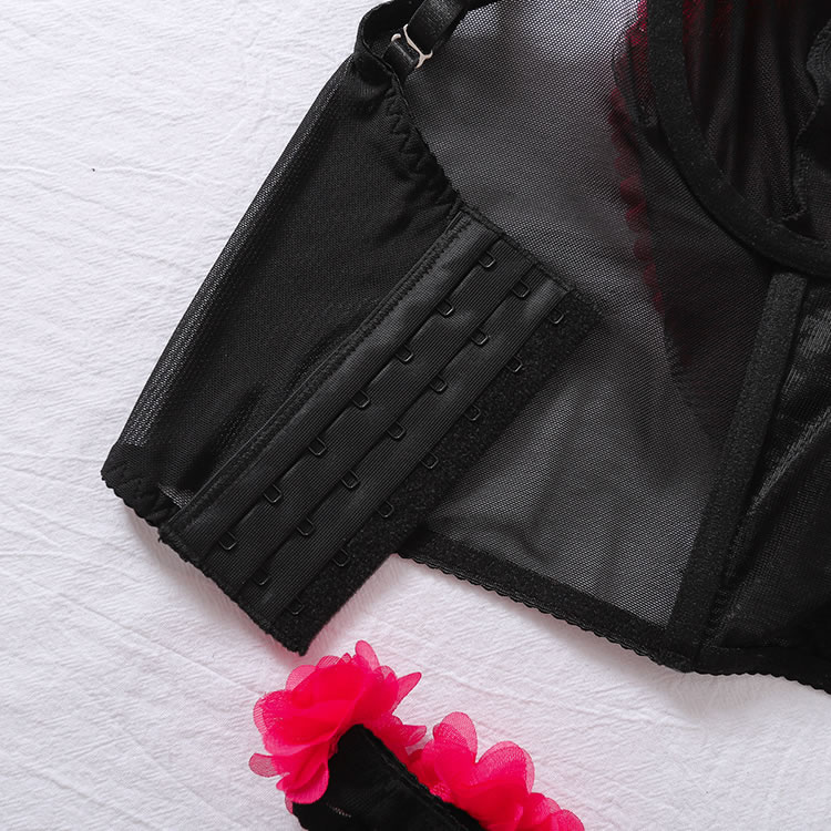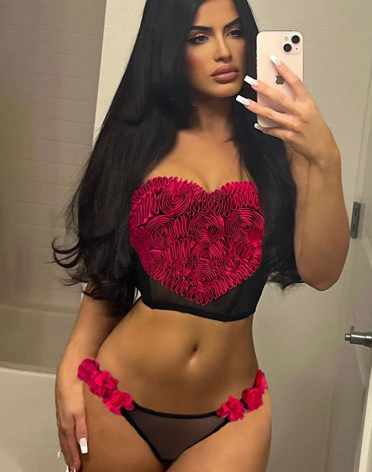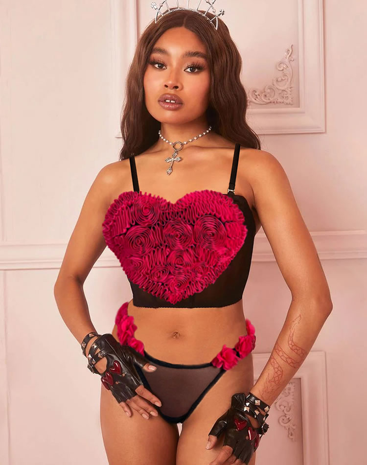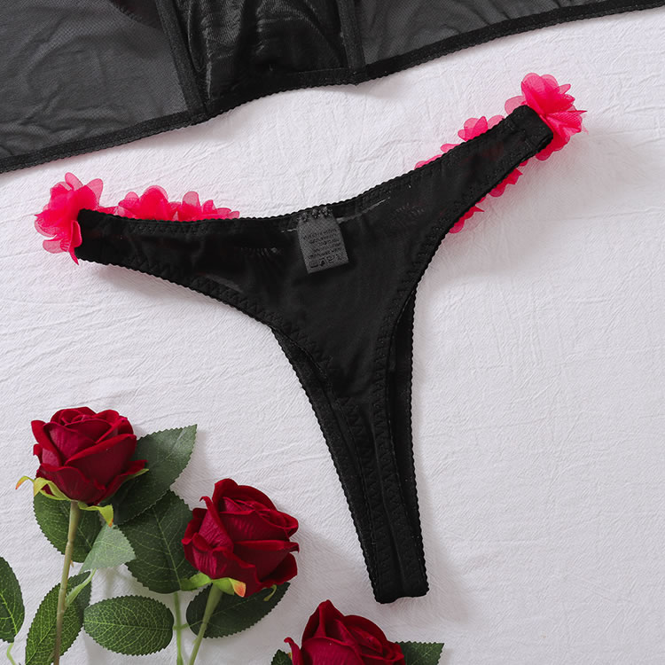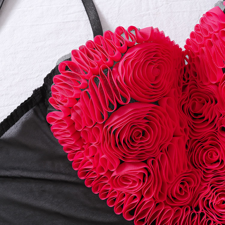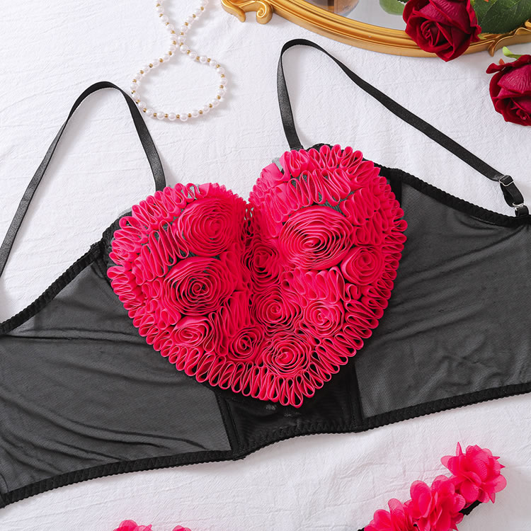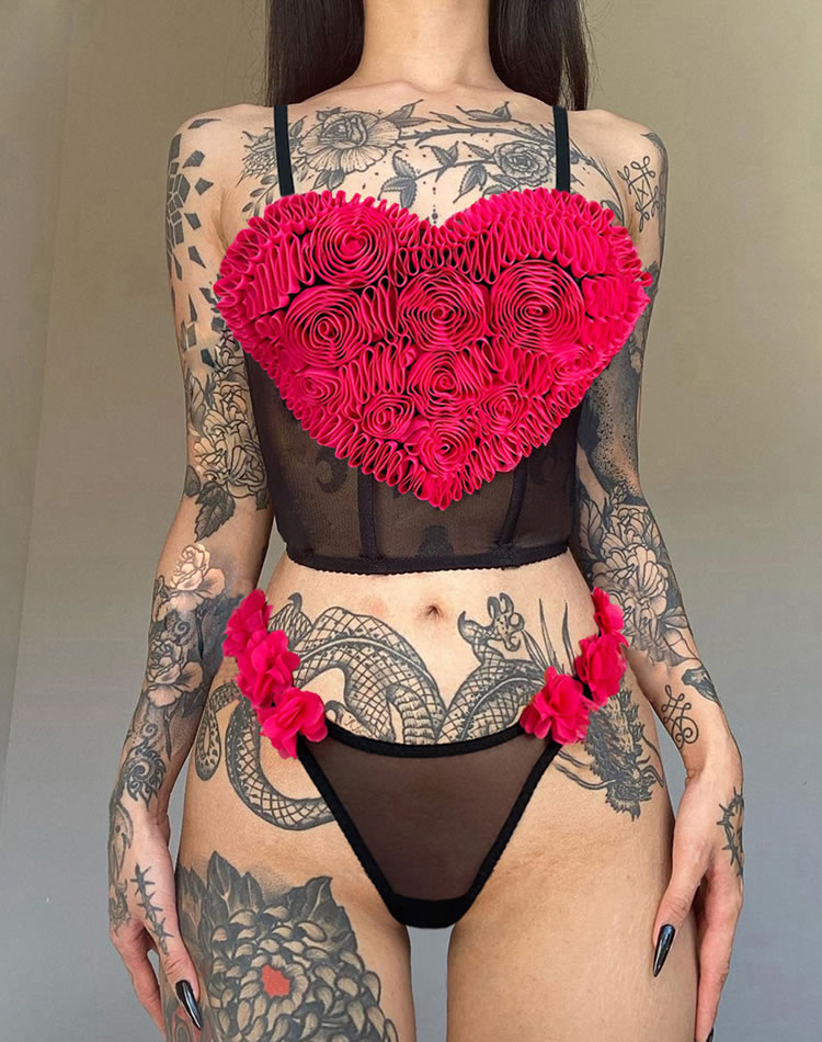Turn up the charm with this stunning lingerie set, featuring a captivating heart-shaped design adorned with delicate floral ruffles. The sheer mesh bodice offers a flirty peek while the adjustable straps ensure a perfect fit. Complemented by matching high-waist panties with floral accents, this set is both playful and alluring, ideal for creating unforgettable moments.