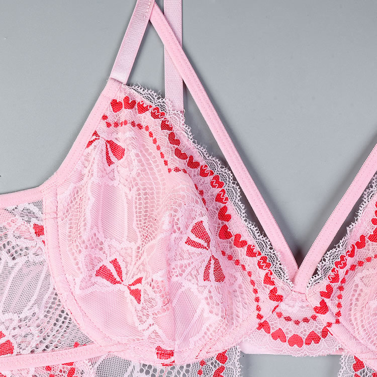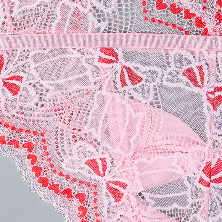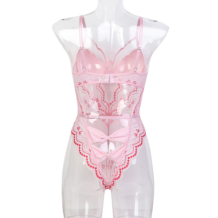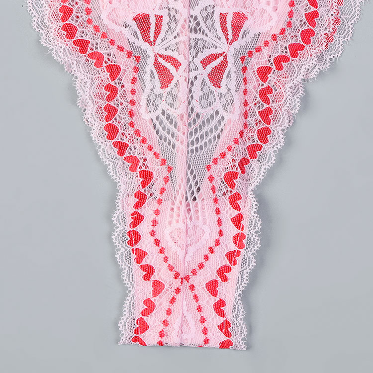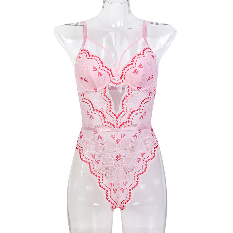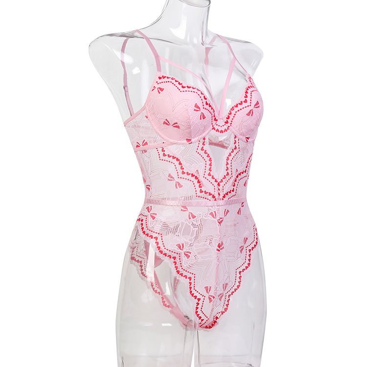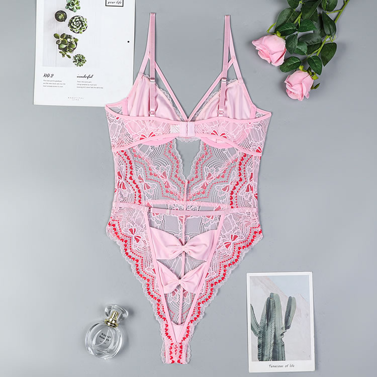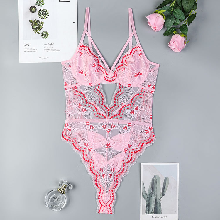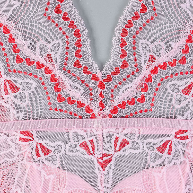 This exquisite lingerie set is designed to exude both elegance and allure. The bodysuit features a deep V-neckline with intricate lace detailing, adorned with heart patterns that add a touch of romance and charm. The sheer mesh fabric enhances the visual appeal, creating a seductive and feminine look. The strappy design at the neckline and the central keyhole cutout add a modern and stylish element, making it perfect for special occasions or intimate moments.