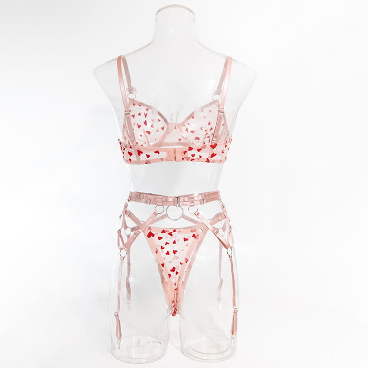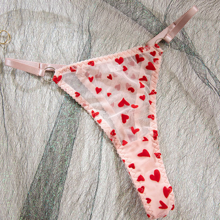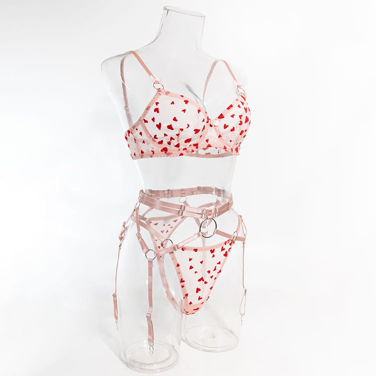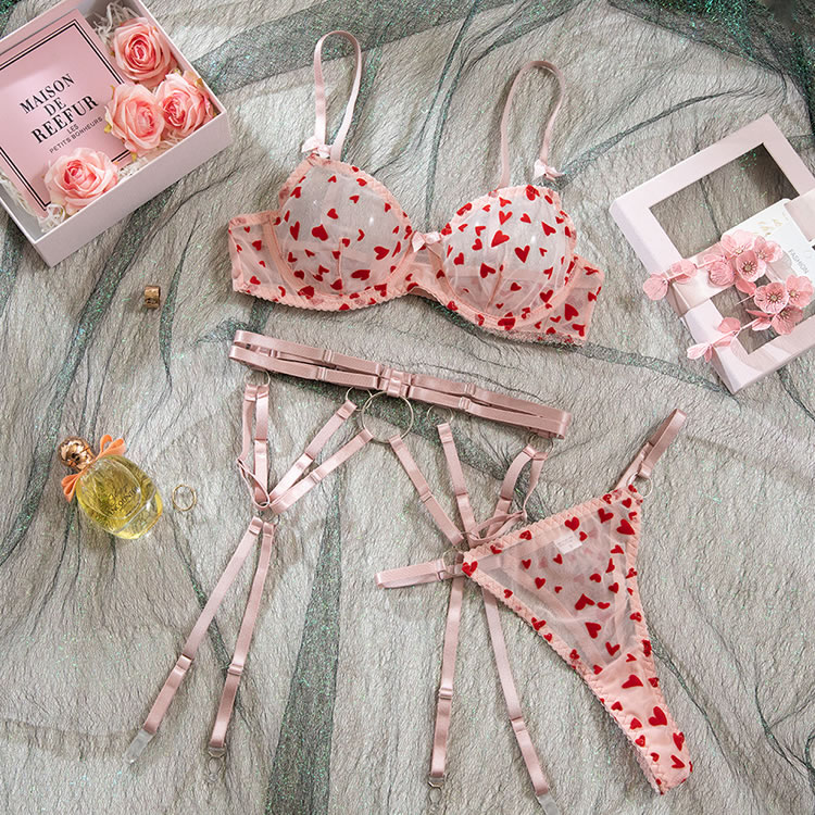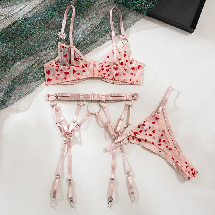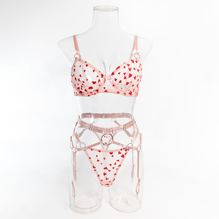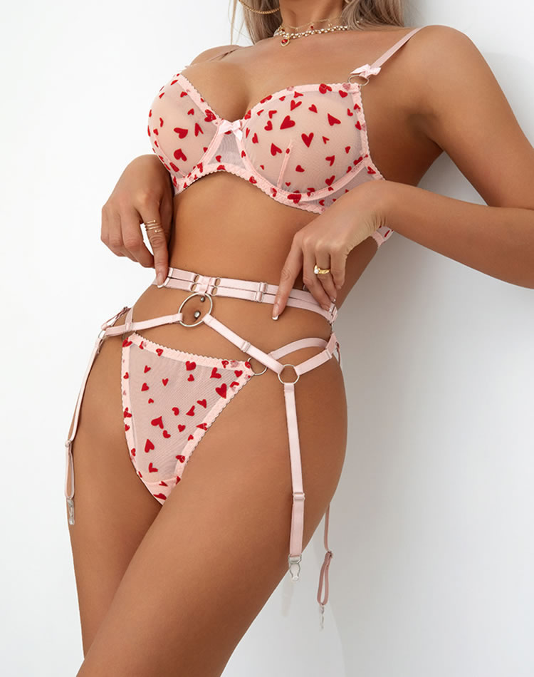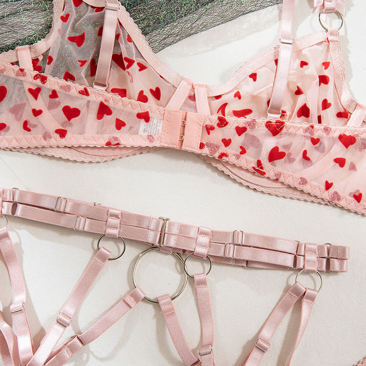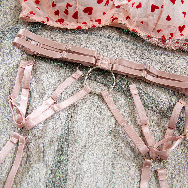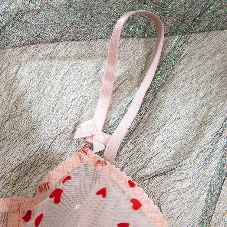 This romantic heart print lingerie set features a playful design with adjustable straps and charming bows. The sheer fabric with red hearts adds a touch of whimsy and allure, while the matching garter belt ensures both comfort and a flattering fit. Perfect for those who want to feel confident and stylish in their lingerie.