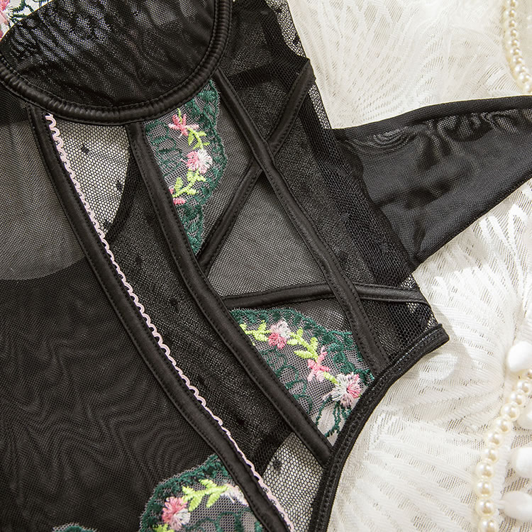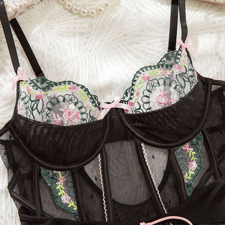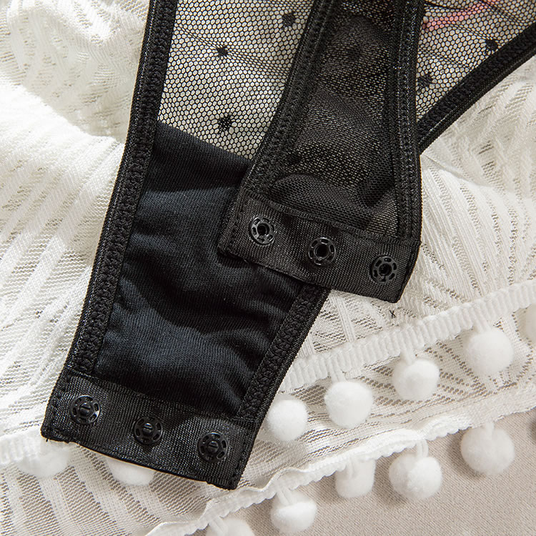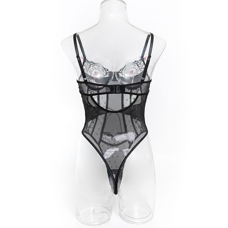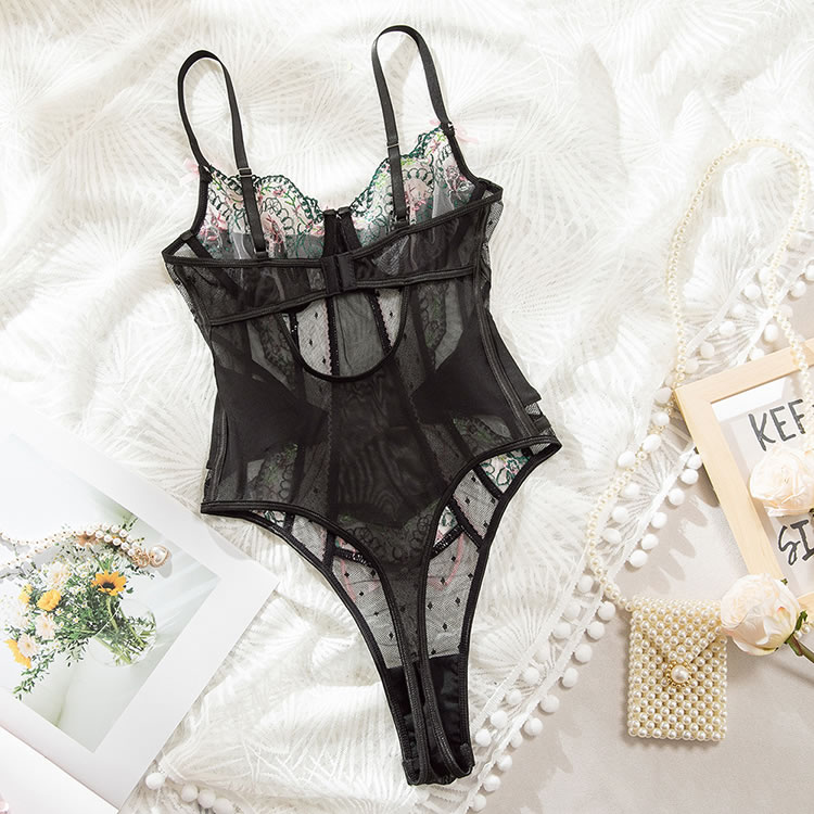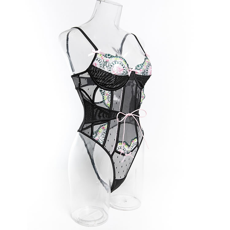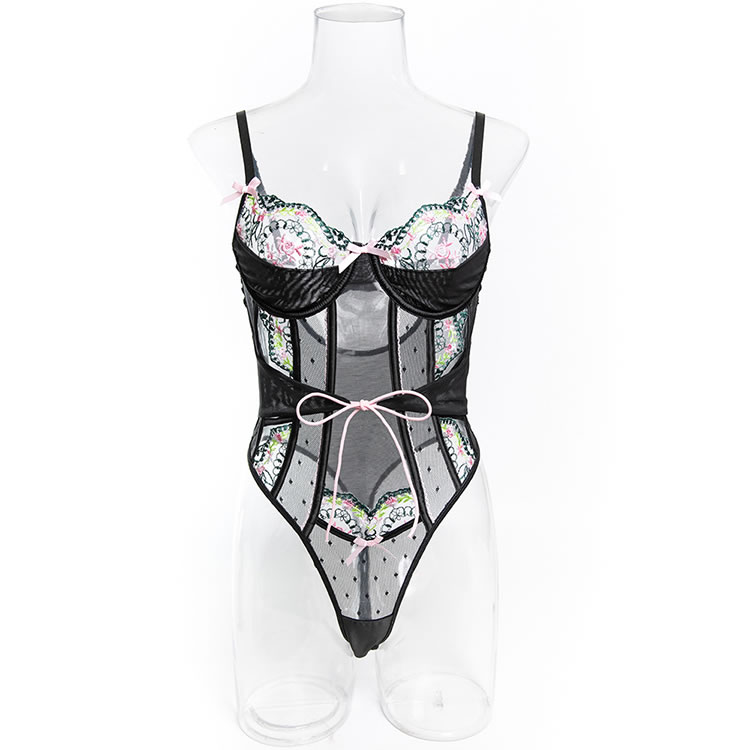 This striking bodysuit combines sheer mesh with floral lace detailing for a mix of edgy and feminine flair. The structured bustier top features soft pink bows at the cups and a central bow accent that adds a playful touch. A cutout panel across the midsection enhances the silhouette, while thin straps and an open back create a sleek, modern look. Designed with a high-cut leg line and minimal coverage, it’s perfect for those who love dramatic style with a hint of romance.