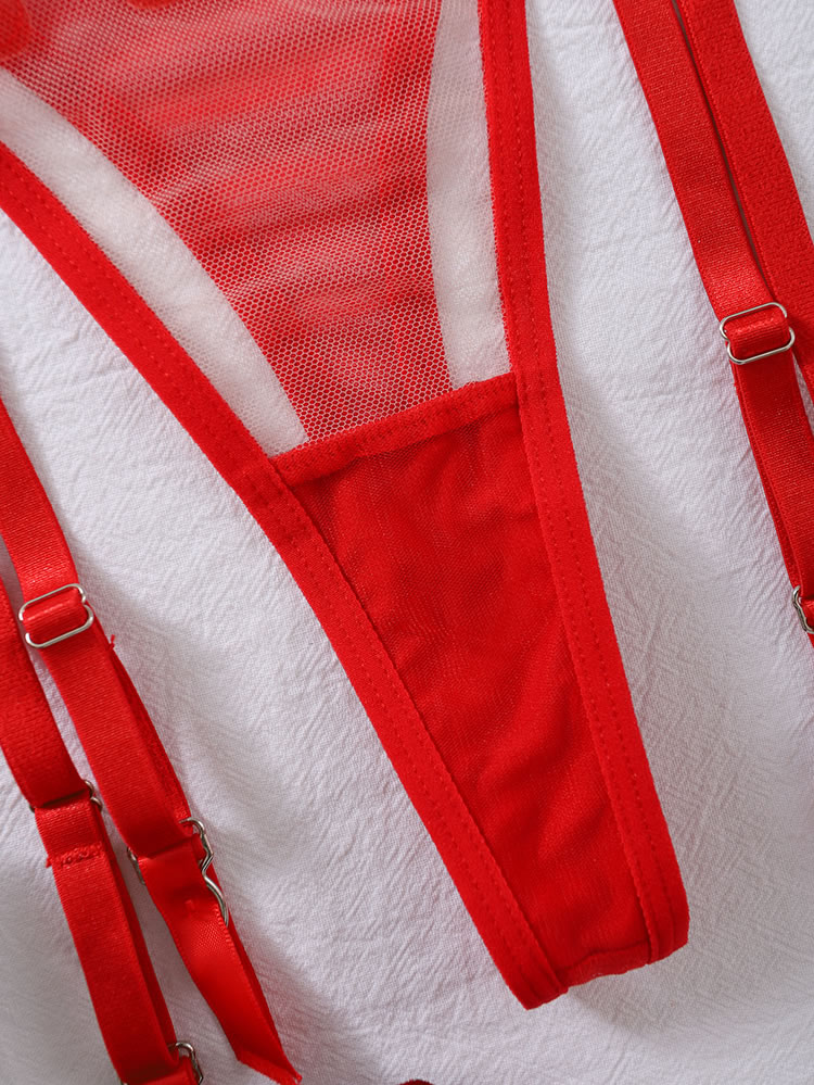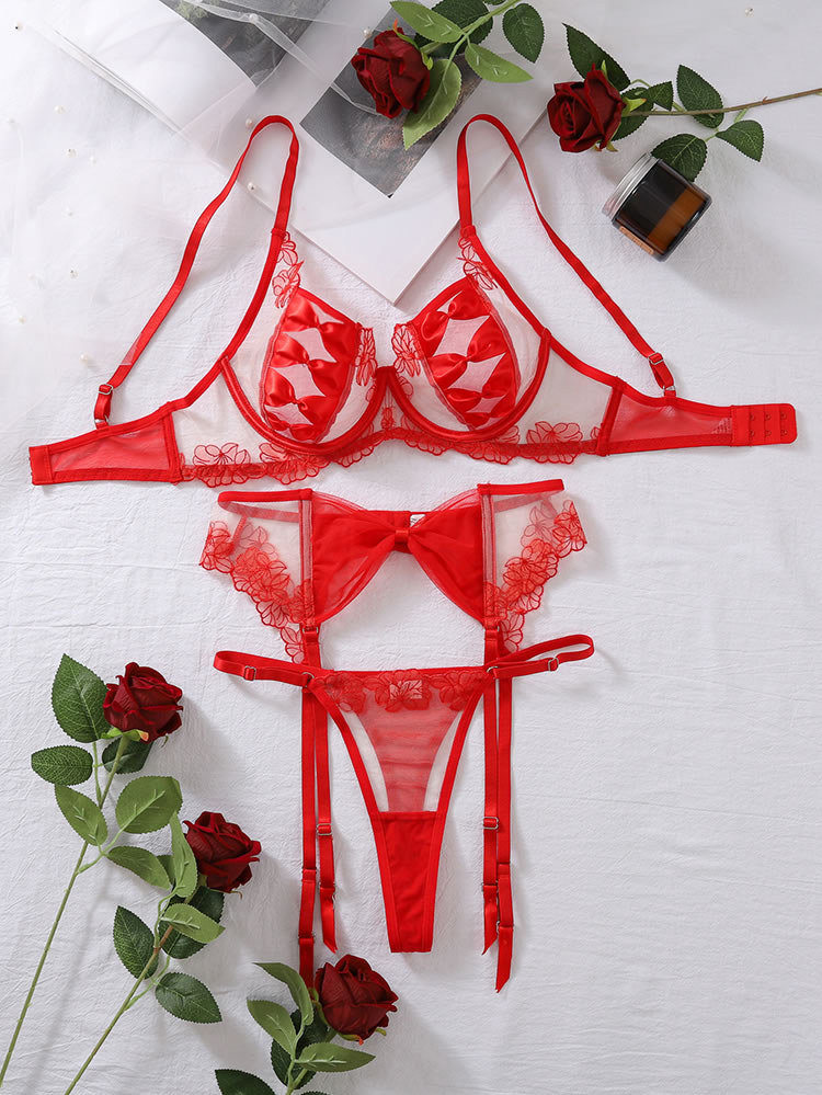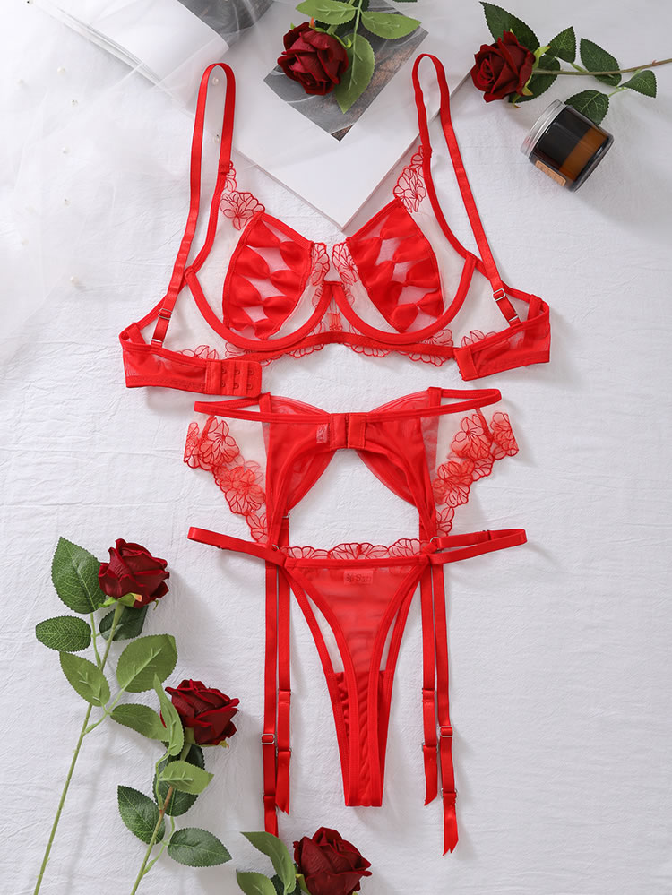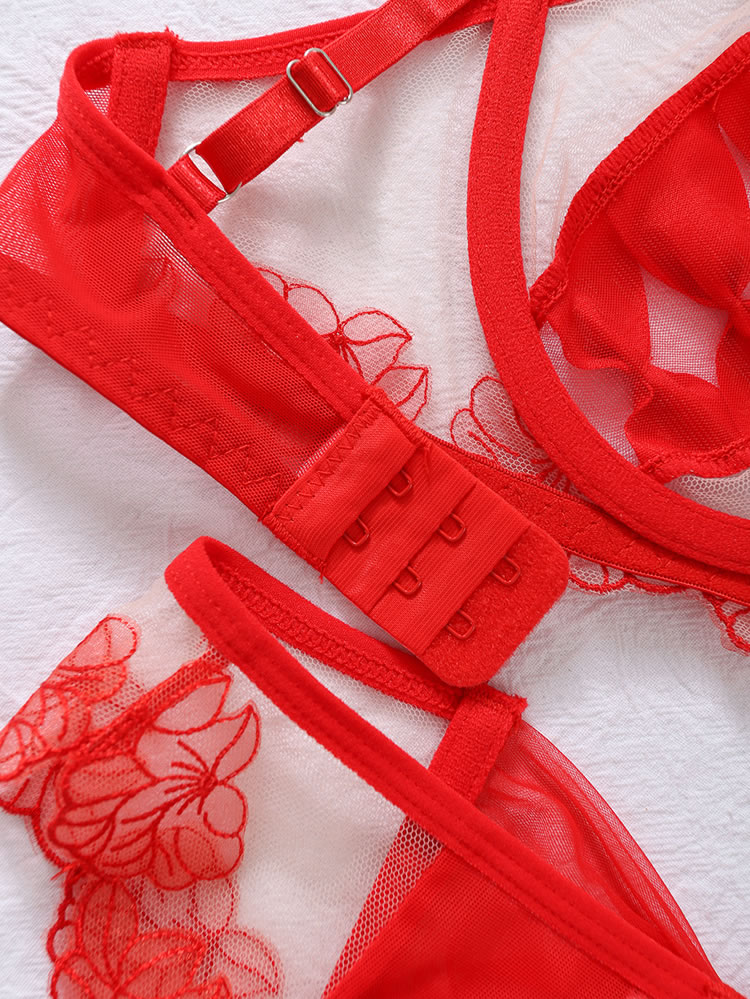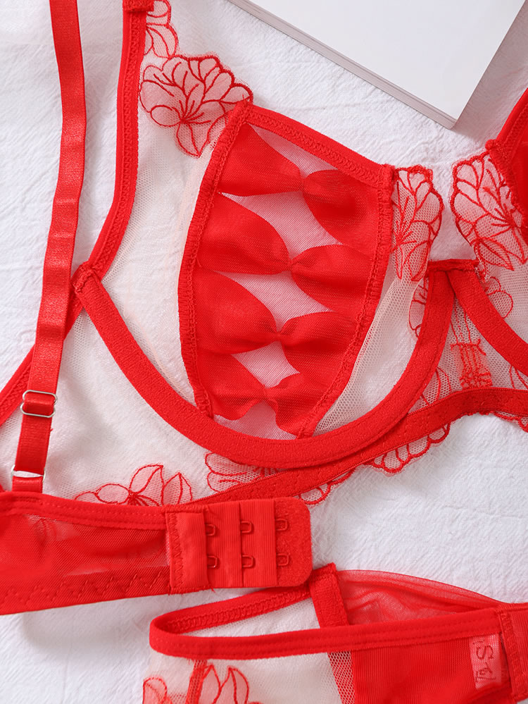 Make a bold statement with this enticing red lace bra set. This 3-piece ensemble includes unlined bra cups, adjustable straps, a garter belt, and a matching thong panty, ensuring a captivating look.