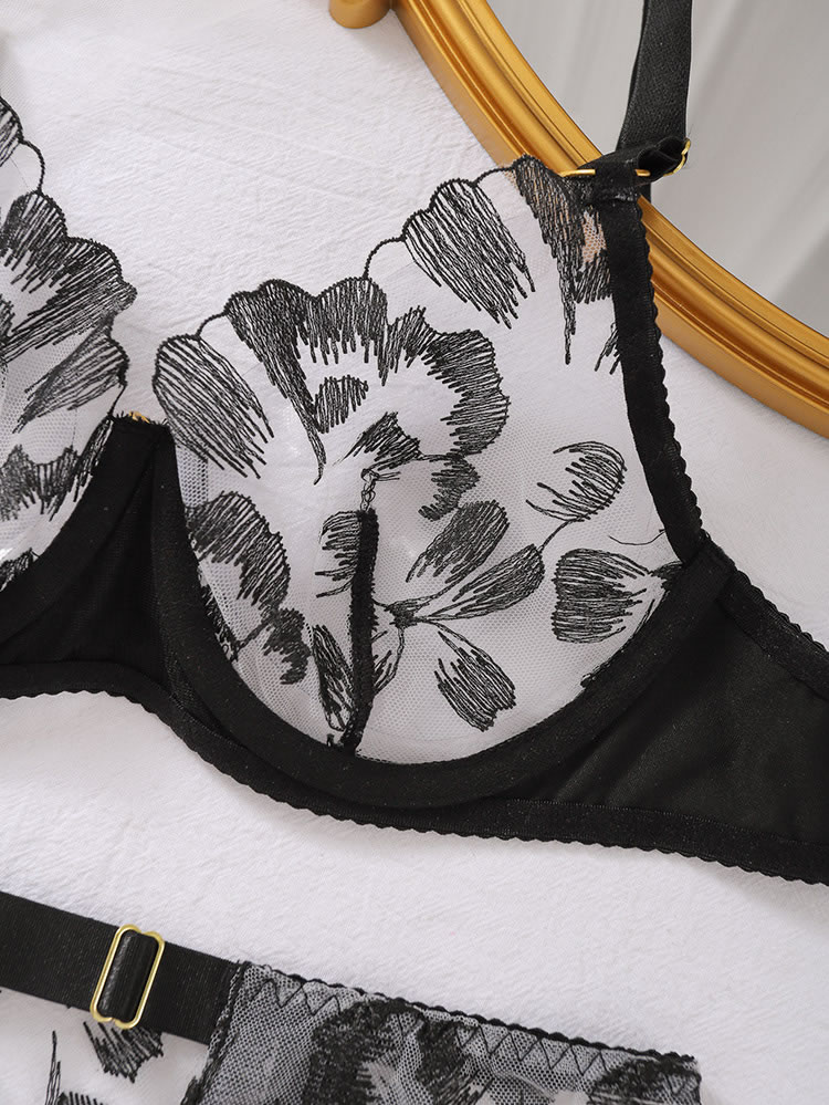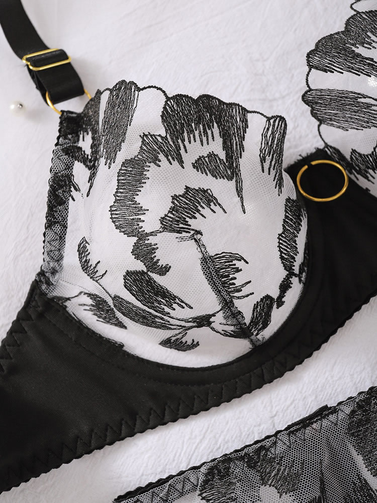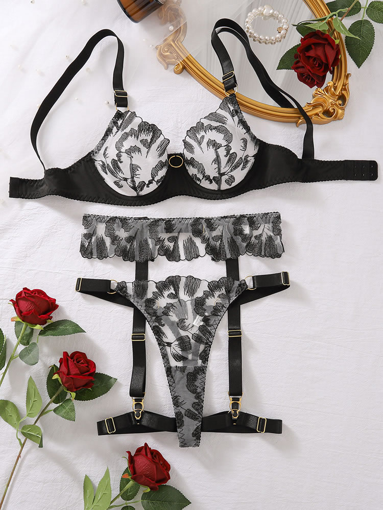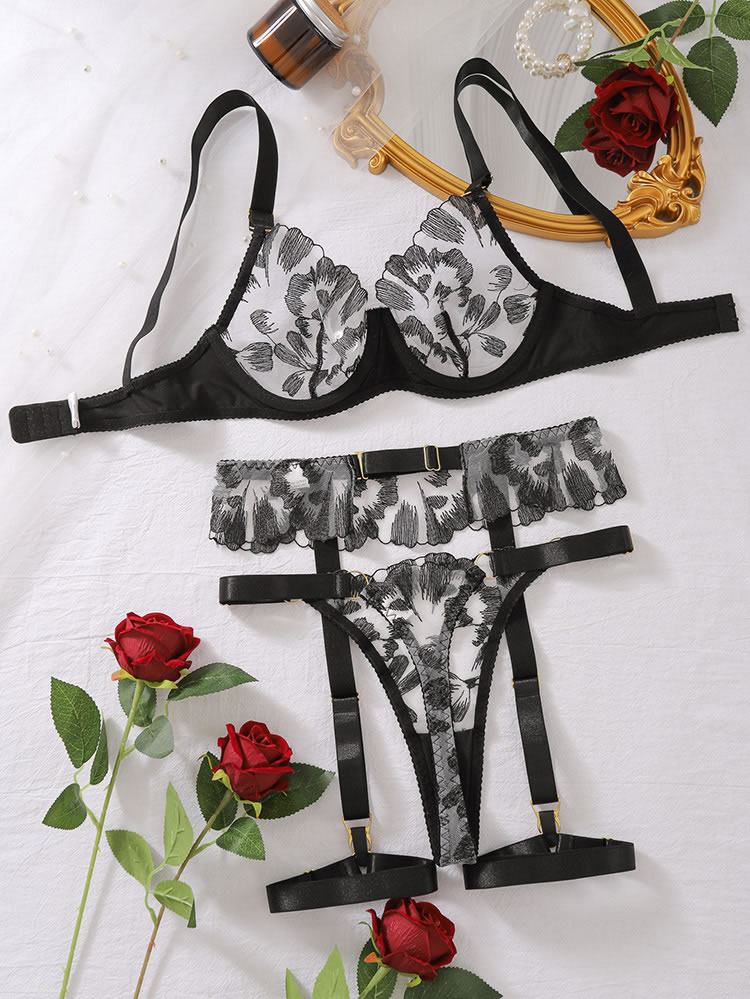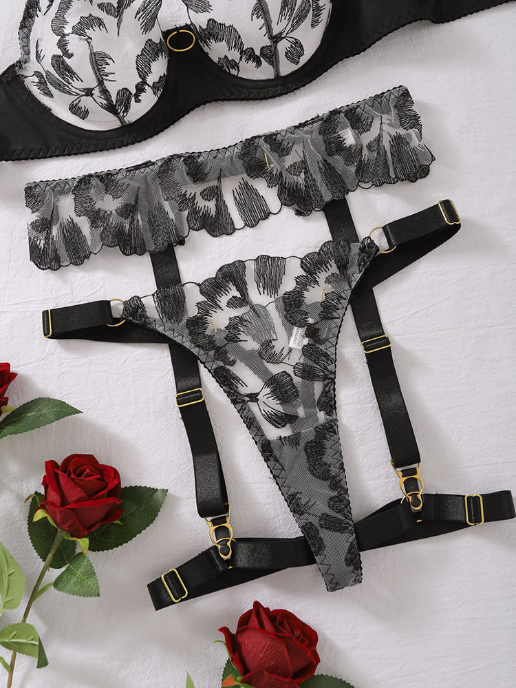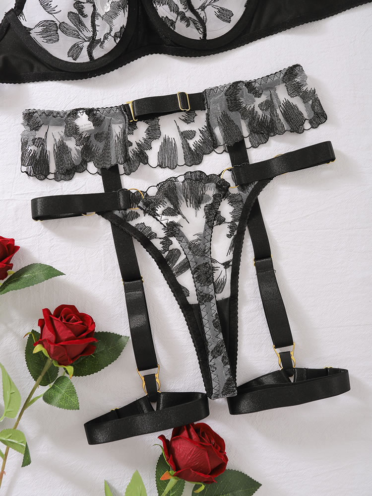 Capture all their attention with this exclusive black bra set. Available in classic black, this 4-piece lace garter set features underwire cups, adjustable straps, and a hook-and-eye back closure. Complete with a seductive garter belt, wraparound leg garters, and a matching thong panty, it's designed to mesmerize and enchant.