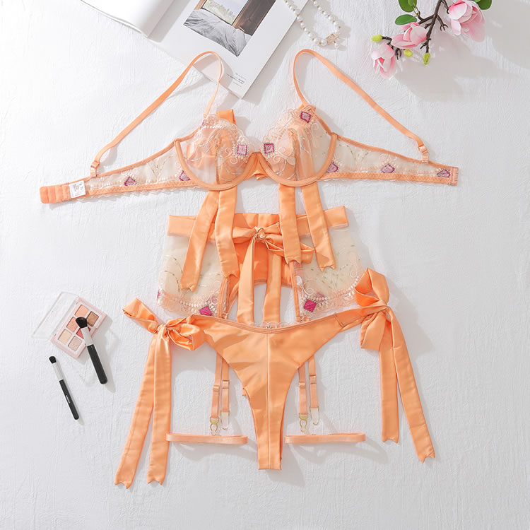 This lingerie set is designed to captivate with its elegant design and seductive appeal. The peach-colored ensemble features delicate lace detailing and charming bows that add a touch of femininity. The sheer fabric offers a playful peek-a-boo effect, while the garter straps keep your stockings in place with style. Perfect for those who want to feel confident and alluring.