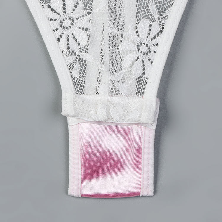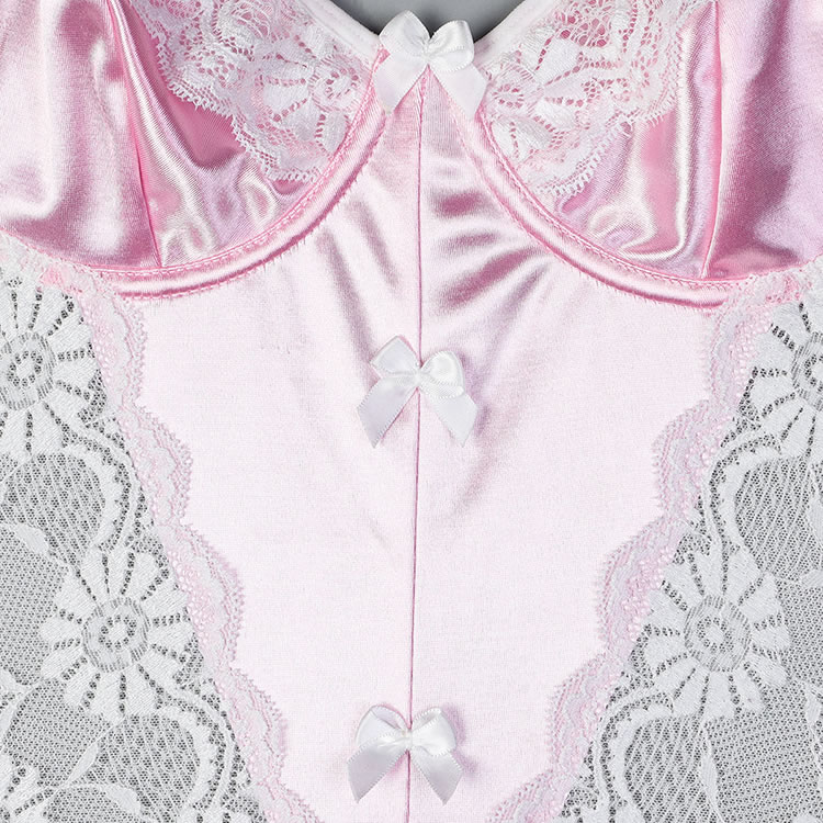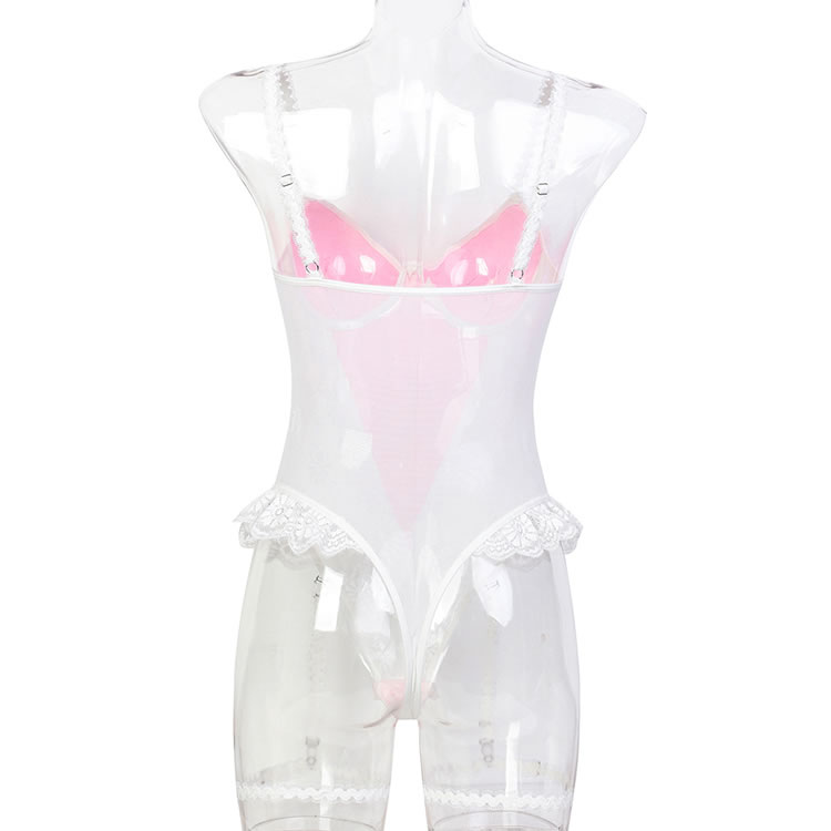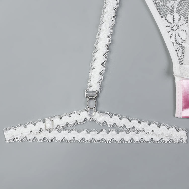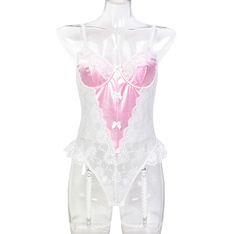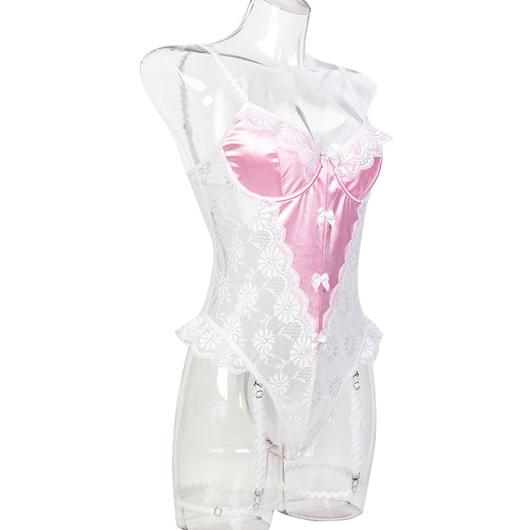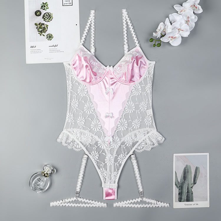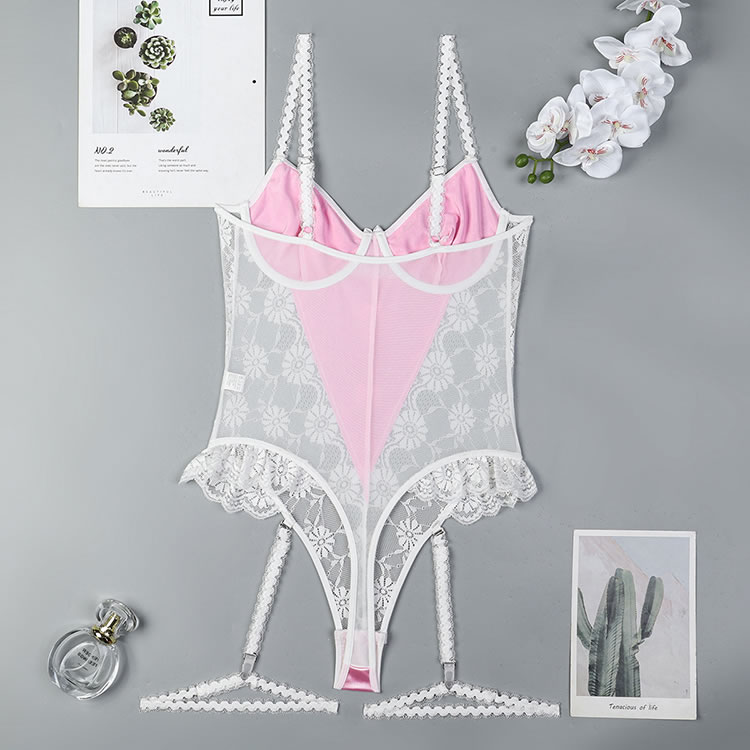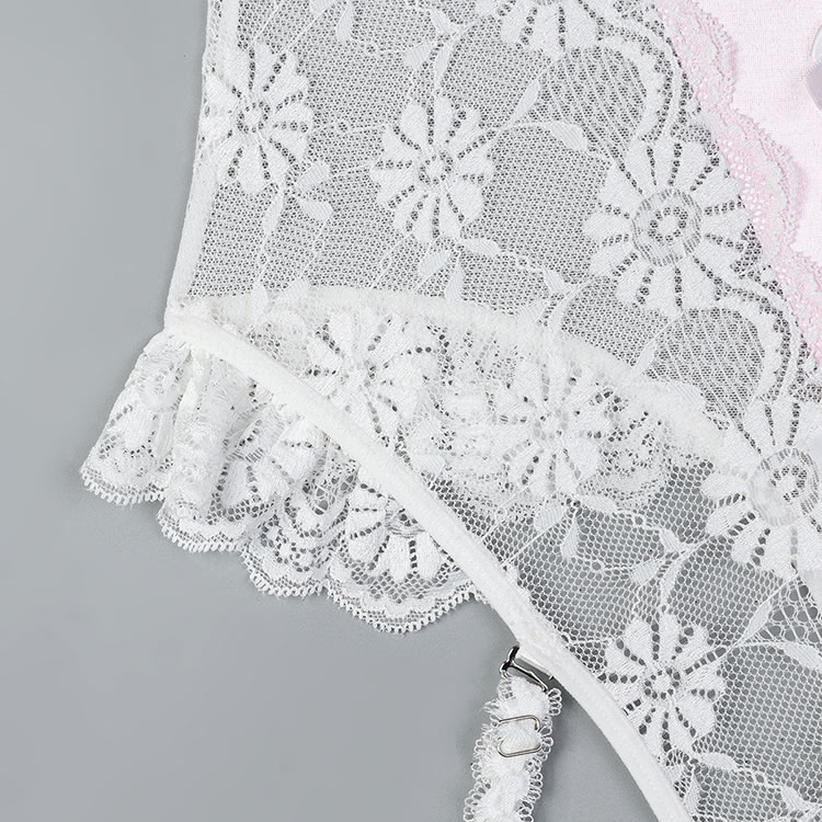 This romantic pink and white lace bodysuit features delicate floral lace detailing that adds a touch of charm and allure. The soft fabric and elegant design create a flattering silhouette, while the garters ensure a comfortable fit. Perfect for those who want to feel confident and stylish in their lingerie.