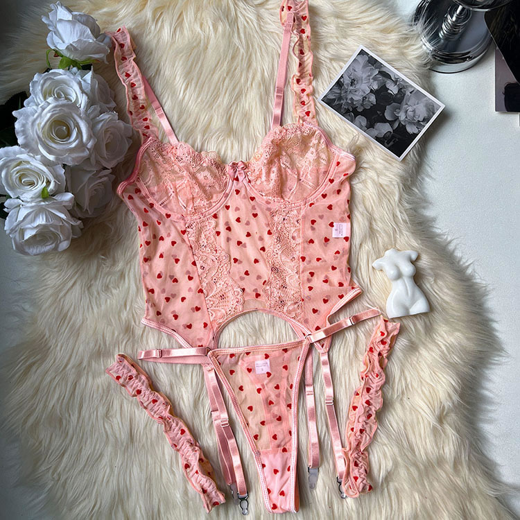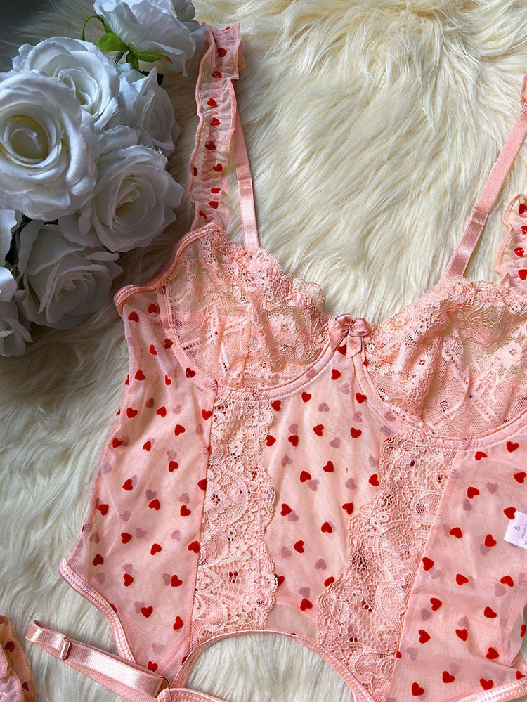 This striking chemises set combines bold lace with vibrant red heart accents for a look that is both edgy and alluring. The intricate lace detailing adds a touch of elegance, while the garter straps ensure your stockings stay in place. Perfect for those who want to make a statement and feel confident in their lingerie.