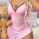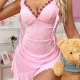 This eye-catching pink dress features a deep V-neckline adorned with a row of red rose embellishments that add a touch of romance. The fitted silhouette highlights the curves, with ruched detailing along the sides and an asymmetrical hem for a flirty finish. Thin straps with flowing ribbon ties enhance the playful design, making it perfect for special occasions or cozy nights with a romantic twist.