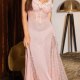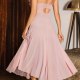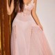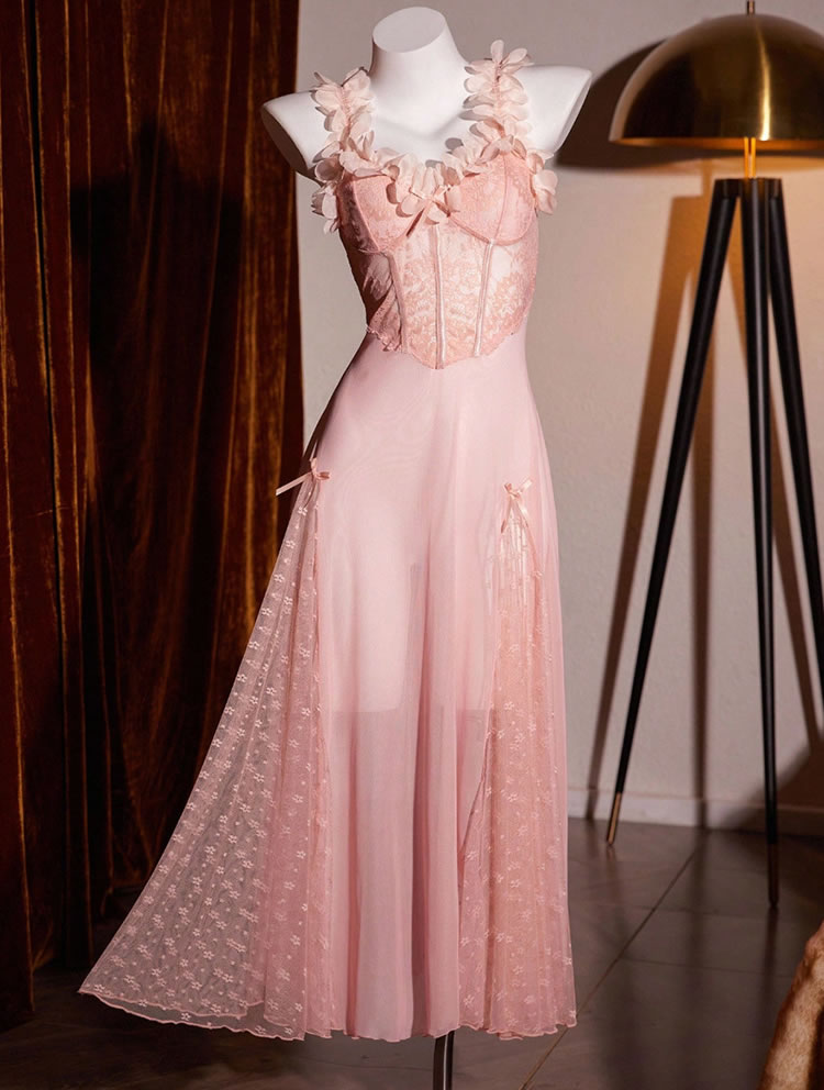This soft pink lingerie dress blends sweet romance with a touch of elegance. Featuring a floral ruffle neckline and lace-trimmed bustier top, it creates a feminine silhouette that flatters the figure. The sheer mesh panel at the waist adds subtle intrigue, while the flowing midi skirt with delicate flowe print gives it movement and charm. Designed with adjustable spaghetti straps and a cutout back detail, this piece is perfect for intimate moments or when you want to feel dreamy and graceful.