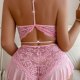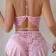 This sweet pink teddy combines playful charm with bold design. The bra features intricate floral lace detailing and a halter-style neckline that enhances the décolletage, while the front cutout adds a flirty touch. A delicate bow at the center draws attention to the bust, and thin straps crisscross at the back for a refined finish, a ruffled hem that adds movement and femininity. Perfect for making a statement during intimate moments or special occasions.