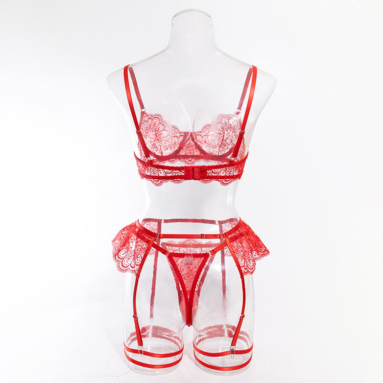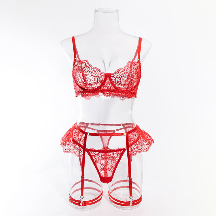 Elevate your intimate moments with this captivating red lace lingerie set. The bralette features intricate floral lace detailing and a sweetheart neckline, complemented by adjustable spaghetti straps for a perfect fit. The matching garter belt and thong add a layer of allure, making it the perfect choice for special occasions.