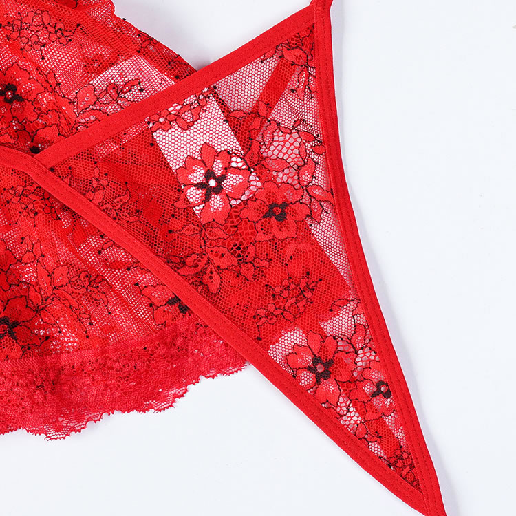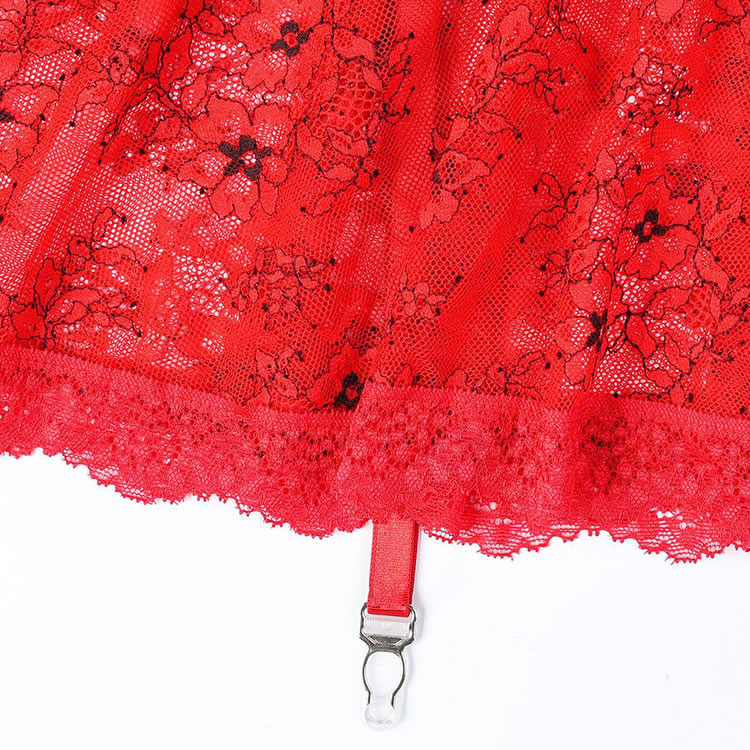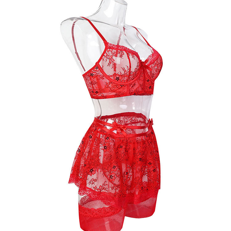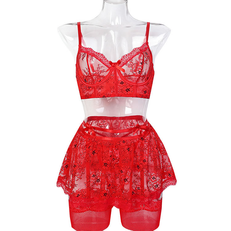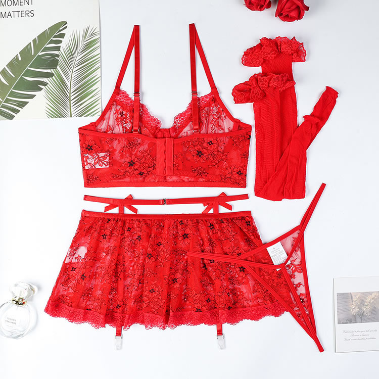 Set hearts aflutter with this sultry red lingerie set, featuring a floral embroidered mesh bra and a matching high-waisted skirt. The sheer cups provide support and a lifted silhouette, while delicate ribbon accents add a touch of playful charm. Complete with an adjustable fit and intricate lace details, this set is perfect for romantic nights or elevating your lingerie collection.