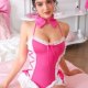 Designed with a fun and flirtatious vibe, this one-piece bodysuit combines a vibrant rose base with contrasting white ruffles and ribbon ties on the sides. The halter-style neckband gives it a classic touch, while the open back and fitted cut highlight the figure. Ideal for adding a pop of personality to your lingerie collection, whether for everyday wear or themed occasions.