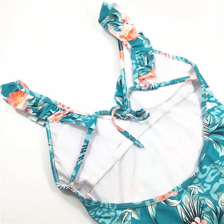 Turn heads at the beach in this sexy swimsuit featuring a colorful flower print, a V-neckline with ruffled trim, shoulder straps, a tie back closure, and a cheeky cut back.