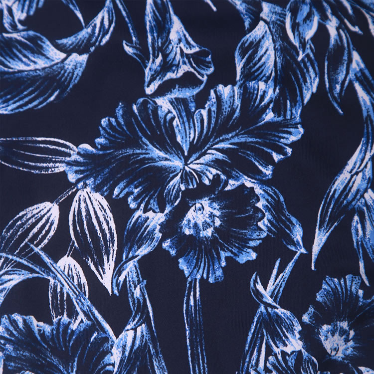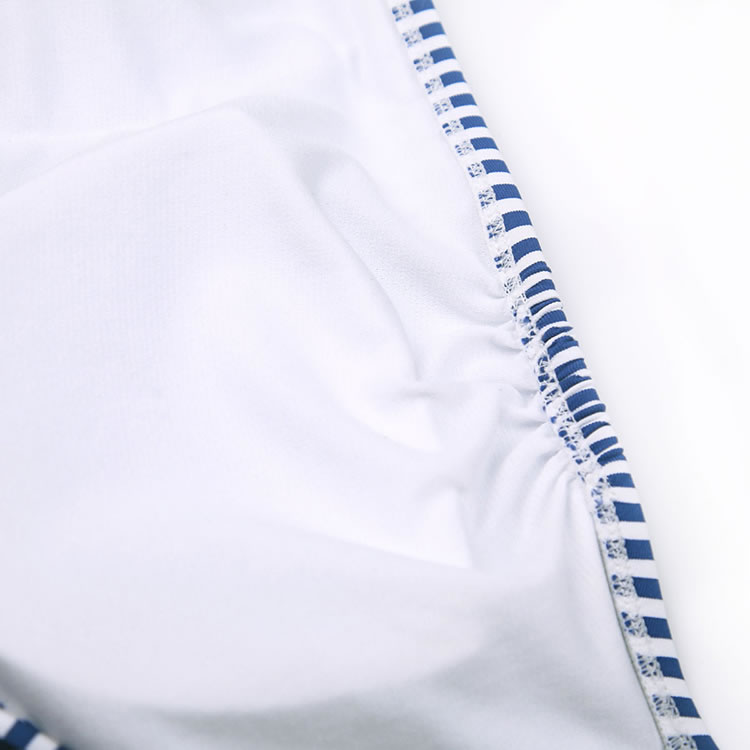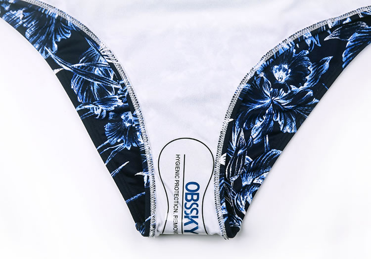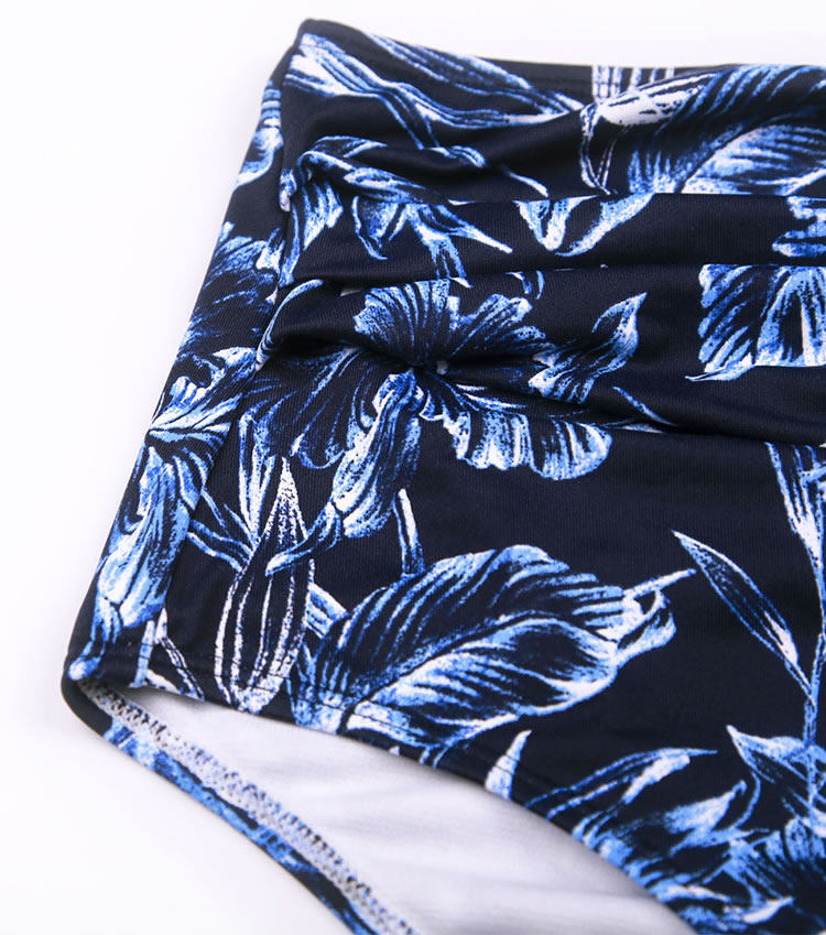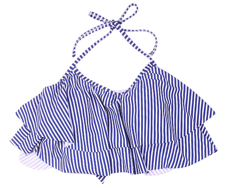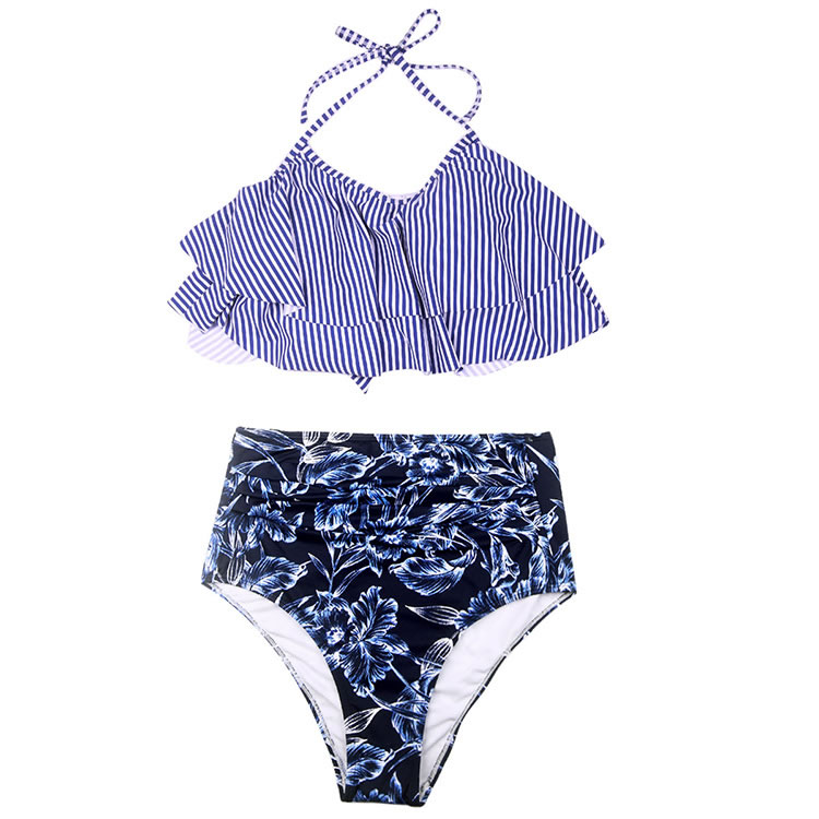 Lounge in the sand in this sexy blue bikini featuring a white and blue striped top, a scoop neckline, ruffled cups, halter straps, a tie back closure, and matching bikini bottom with an allover blue flower design, a high waist and a cheeky cut back.